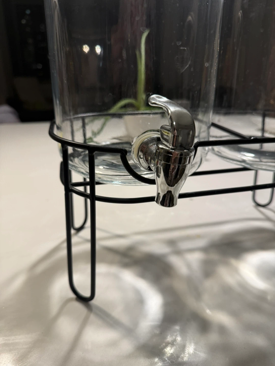 I'm selling a double beverage dispenser. It features two glass containers on a metal stand, each with its own spigot. Perfect for parties or gatherings!
