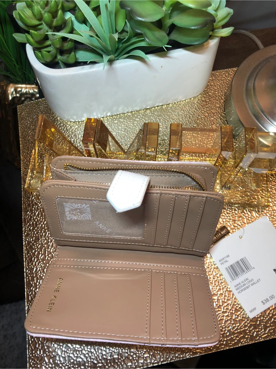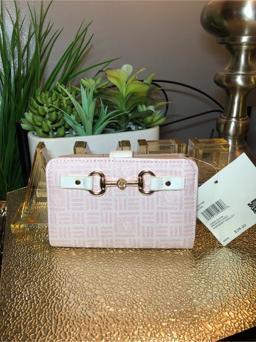 This is an Anne Klein Medium Logo Horsetbit Wallet in the color Petal. It's a stylish and functional wallet with a unique design. Originally priced at $38.00, this wallet is a great accessory to keep your essentials organized