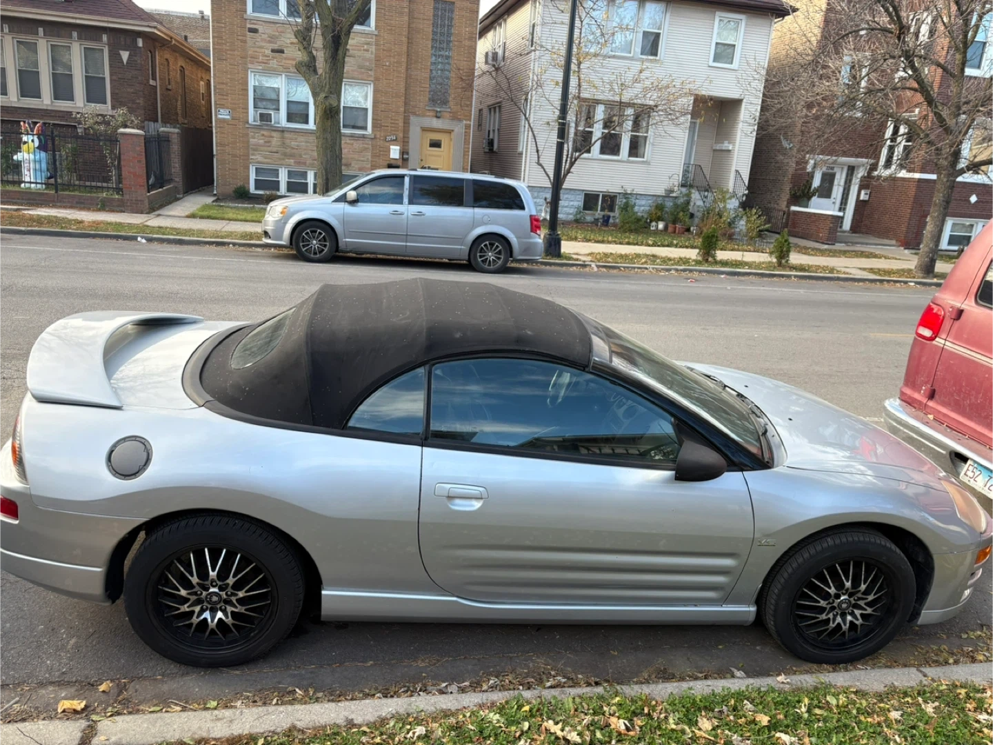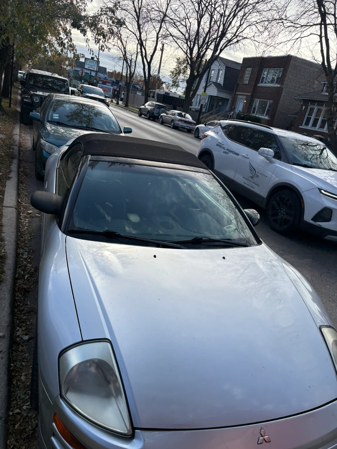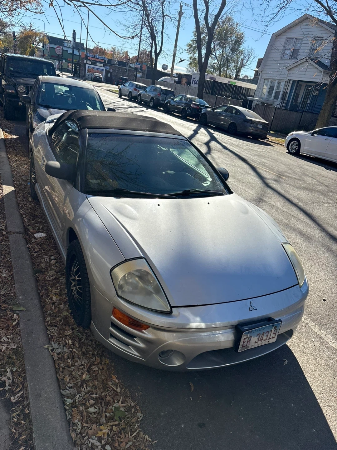 Selling a Mitsubishi Eclipse convertible car. The car is silver and black. The interior is black leather. The car has black rims.