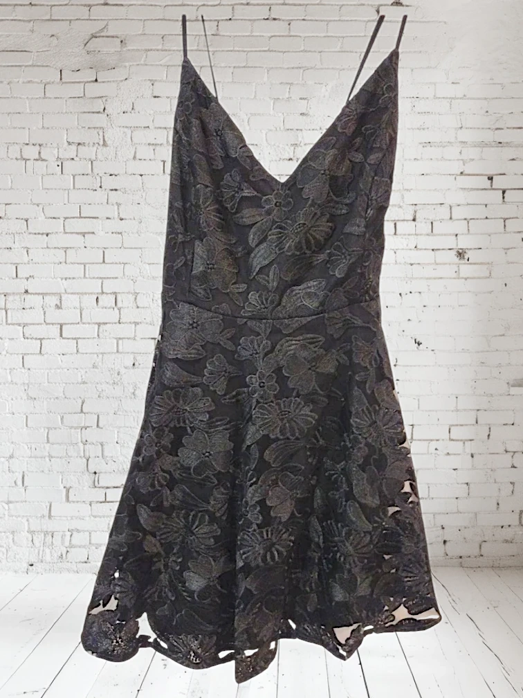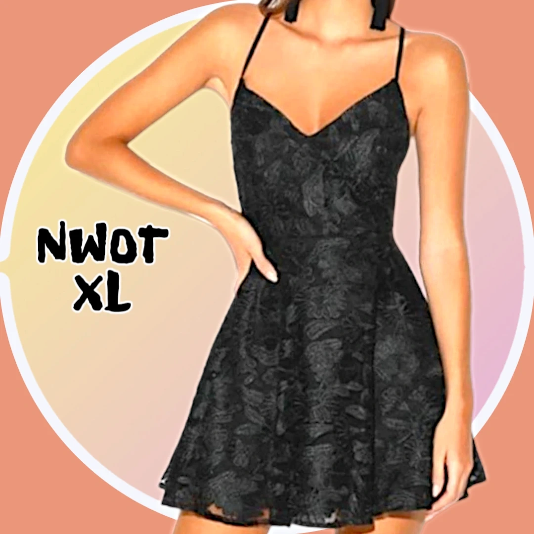 This is a new, without tags (NWOT) black floral lace mini dress in size XL. It features a V-neck and a criss-cross back design. Perfect for a night out!
