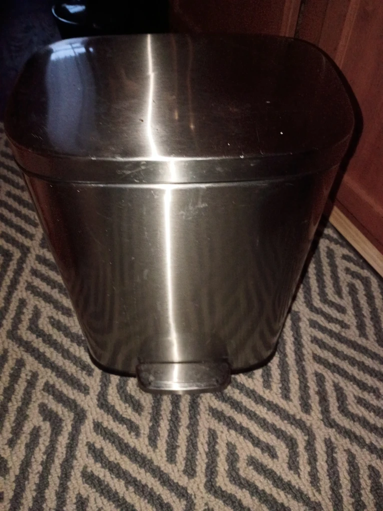 Selling a stainless steel small step trash can, waste paper basket. It's perfect for any room and very durable. Shows normal wear but still in good condition. This is the smaller 1 that can go in a bathroom or any other room, but usually a 30 gallon 1 goes in the kitchen. This is not that.
