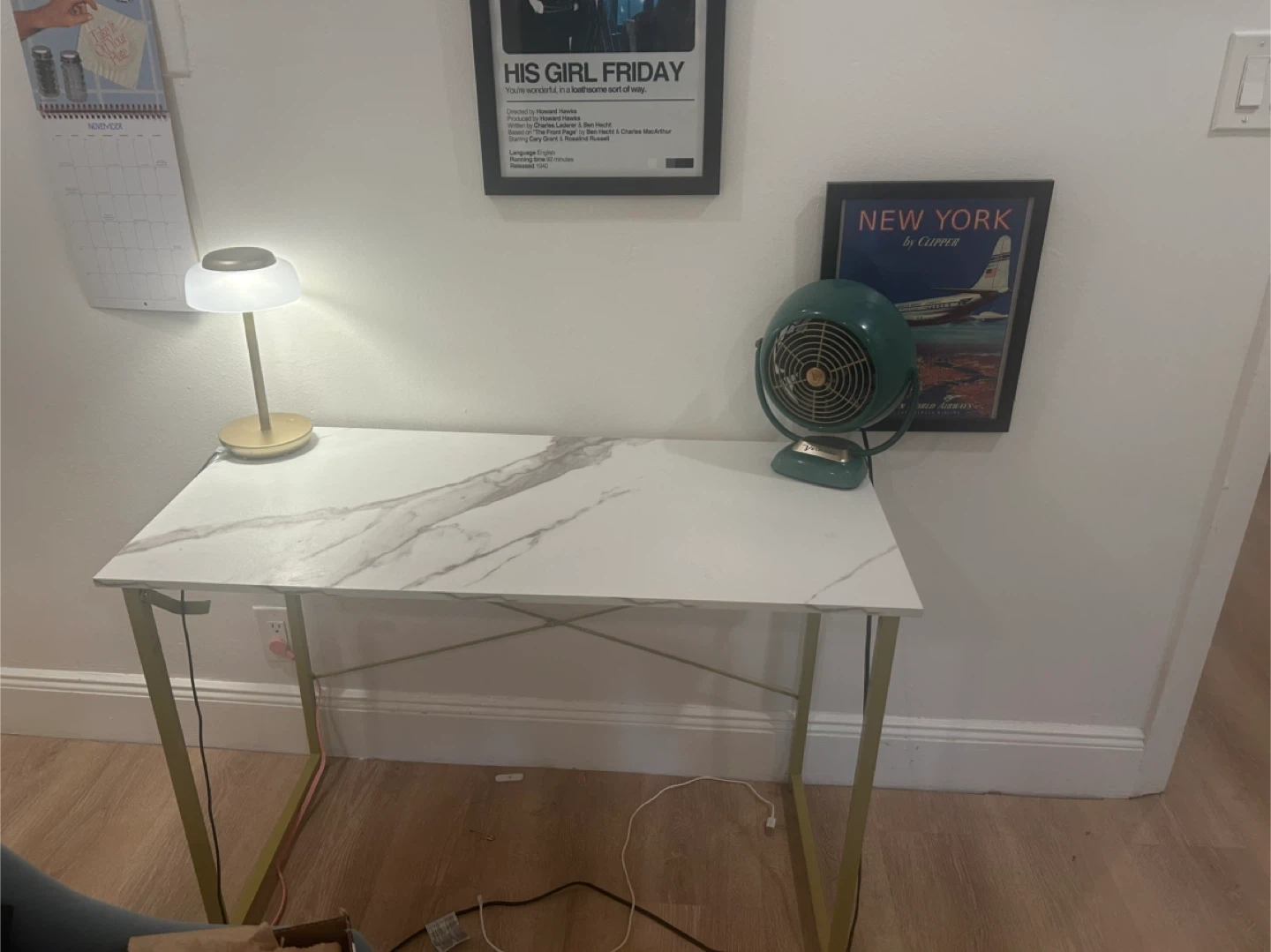 Selling a stylish desk with a white marble-look top and gold legs! It's in great condition and would look perfect in any home office or study space. Great condition.