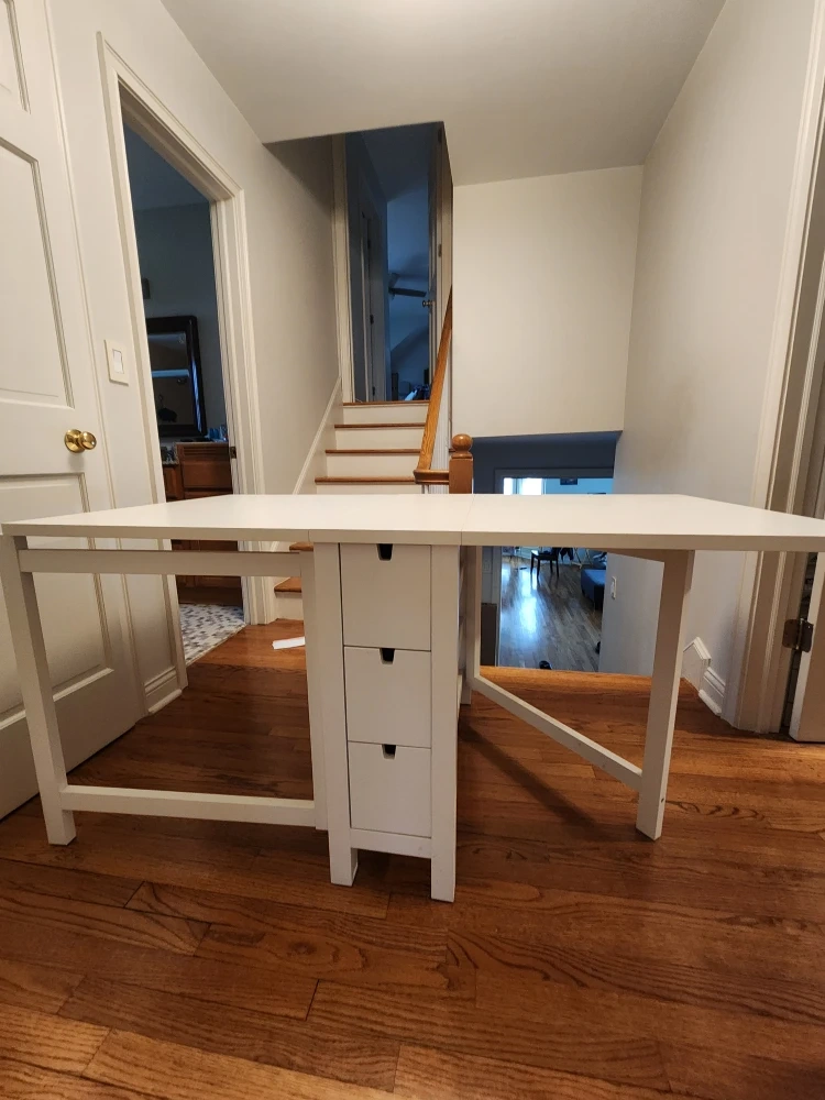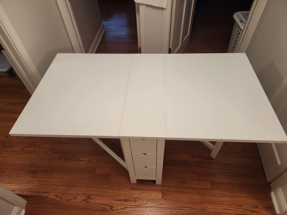 Selling an IKEA Norden extendable folding table in good condition! This table is perfect for small spaces and can be easily folded up when not in use. It features a drop-leaf design and a built-in storage drawer. Great for dining or as a workspace