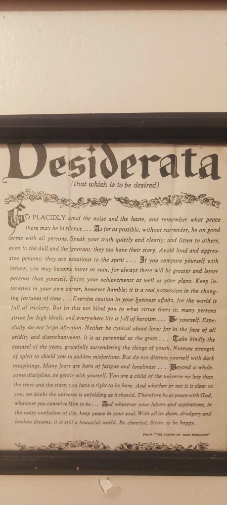 1000+Here's a framed print of the Desiderata poem, from "The Poems of Max Ehrmann". It's a beautiful piece with a classic message!! "DESIDERATA Go placidly amid the noise and haste, and remember what peace there may be in silence.....As far as possible, without surrender, be on good terms with all persons...Speak your truth quietly and clearly; and listen to others, even to the dull and ignorant: they too have their story....Avoid loud and aggressive persons: they are vexatious to the Spirit"......etc." 11"× 9". ALL MY PRICES ARE NEGOTIABLE !!