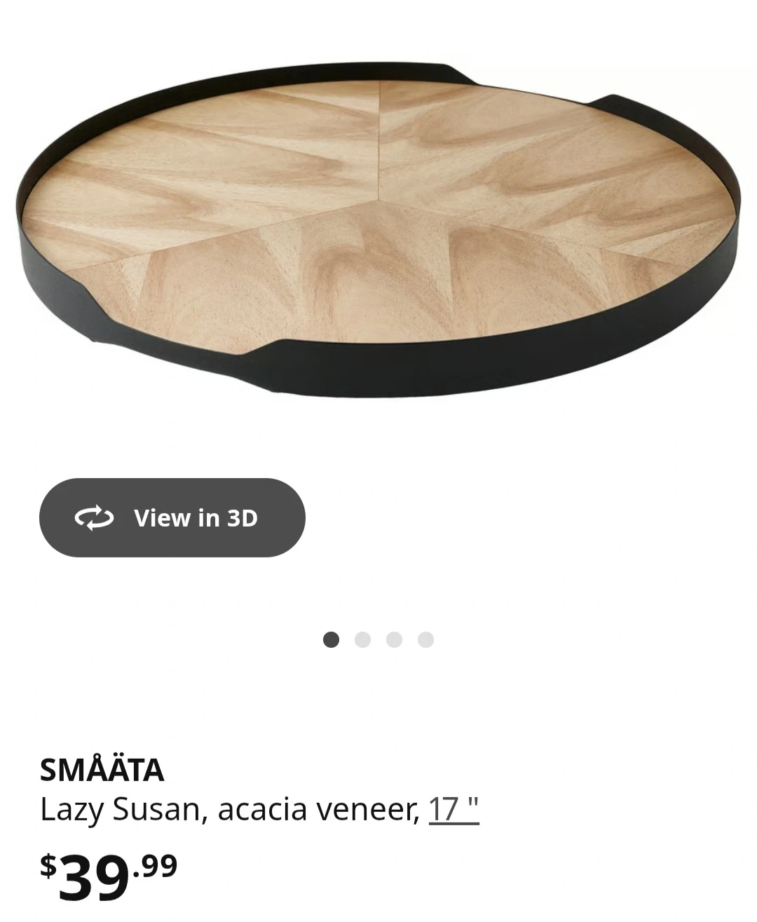 Buy & SellIKEA SMÄÄTA Lazy Susan - 17"IKEA SMÄÄTA Lazy Susan - 17"$25Selling like new IKEA SMÄÄTA Lazy Susan. It's 17 inches in diameter and has a nice acacia veneer. ConditionLike newWHERE TO MEETCheck LocationView MapSELLERNelizaProspect Heights231 review0 chats·3 favorites·43 views