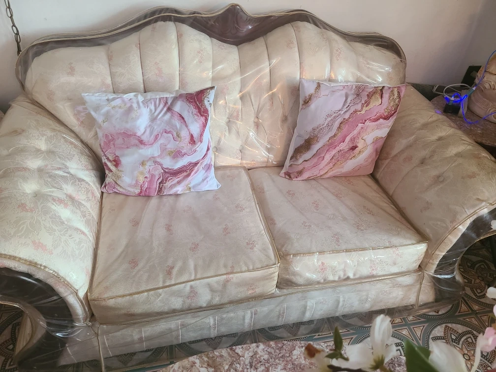 Selling a vintage sofa set including a loveseat, couch, and chair. The set features a unique design with a cream and brown pink color scheme. The material patterned fabric, and each piece has a distinctive curved armrest design. Perfect for adding a touch of classic elegance to your living space. The Sofa have plastic but you can Remove them.