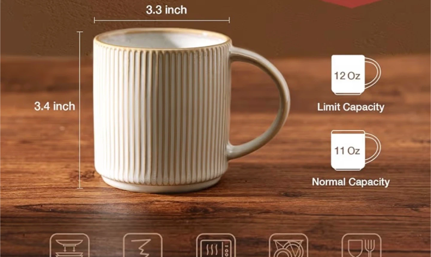 I'm selling a set of 6 cream-colored mugs. They feature a ribbed design and each mug has a 12 oz capacity. The mugs are 3.3 inches wide and 3.4 inches tall. They're perfect for coffee, tea, or any beverage you like!