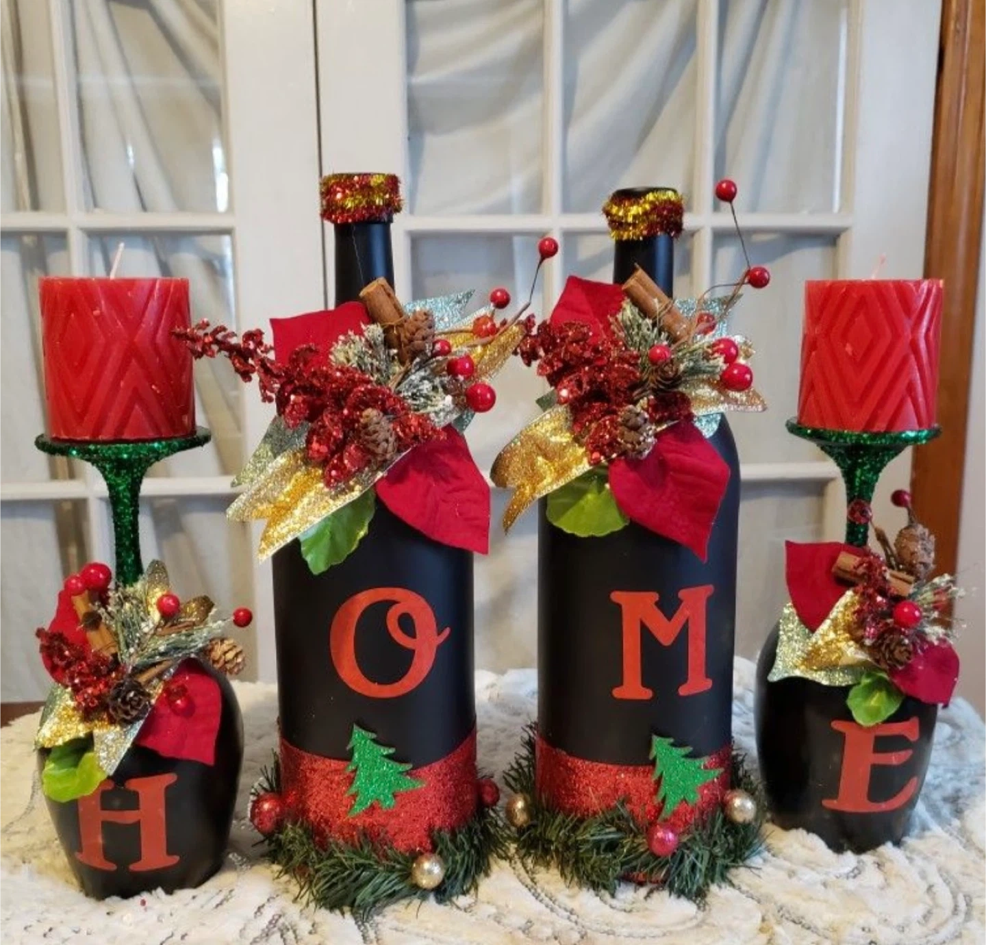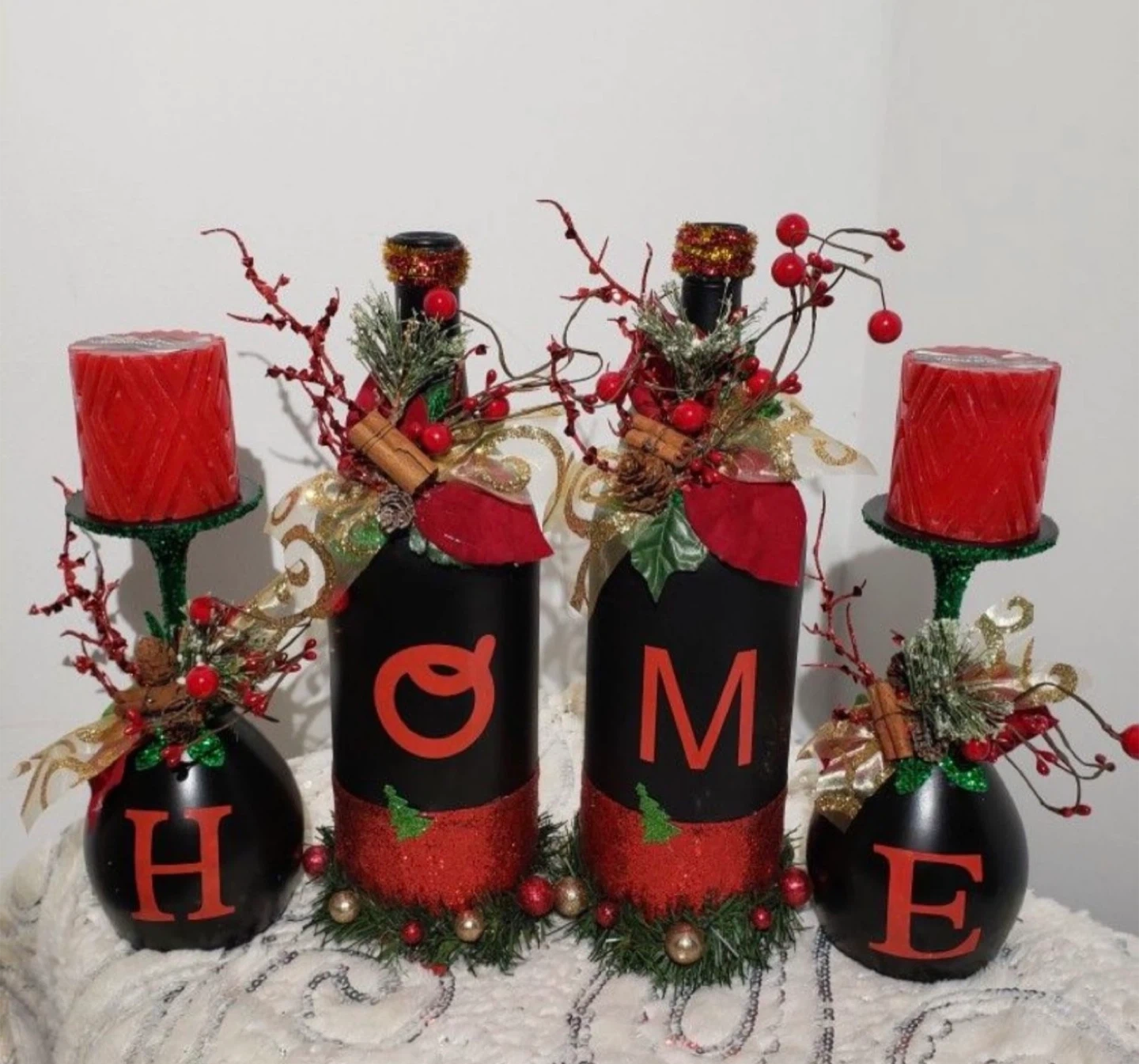 Add a touch of festive charm to your home with these handcrafted holiday decorations! These unique pieces feature decorated wine bottles and matching candle holders, perfect for adding a cozy and cheerful vibe to any room. Each set is carefully assembled with attention to detail, making them a delightful addition to your holiday decor