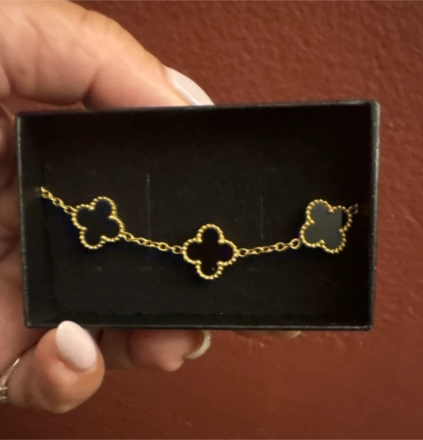 Selling a beautiful 18 K gold stainless steel Black onyx clover bracelet. This elegant piece features a clover motif in black with a gold chain. It comes with its original box, making it perfect for gifting or treating yourself! New