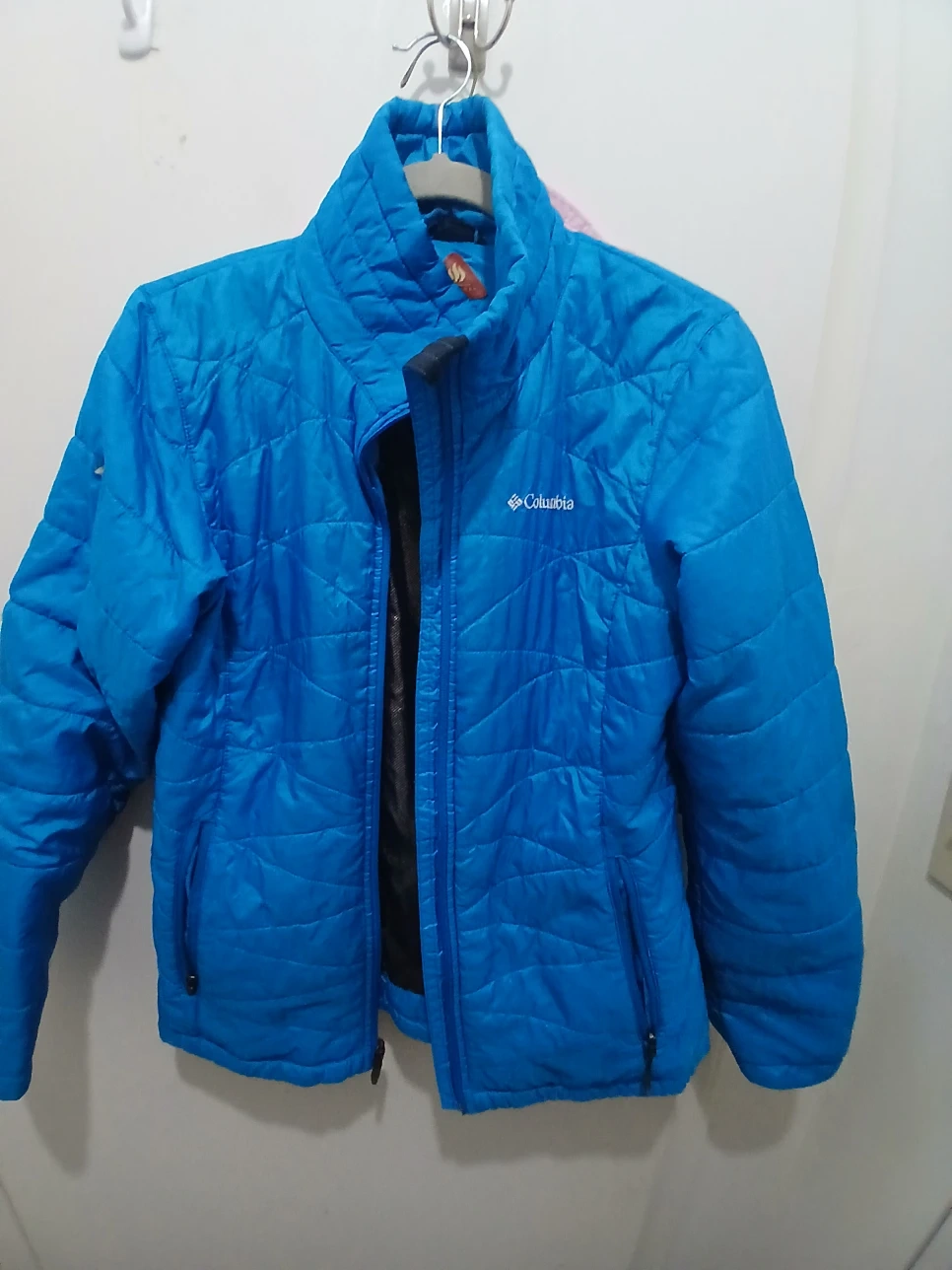 Selling a Columbia girls jacket in a bright blue color! It's a lightweight and portable jacket, perfect for everyday wear. There is a small tear on the sleeve.