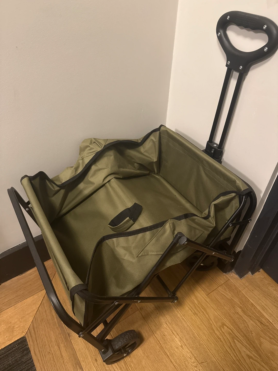Selling a gently used olive green collapsible outdoor utility wagon. It's perfect for hauling groceries, camping gear, or anything else you need to transport! It's lightweight and easy to fold up for storage