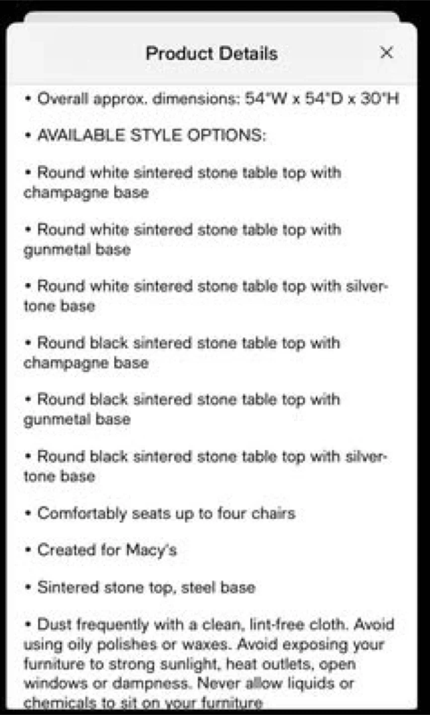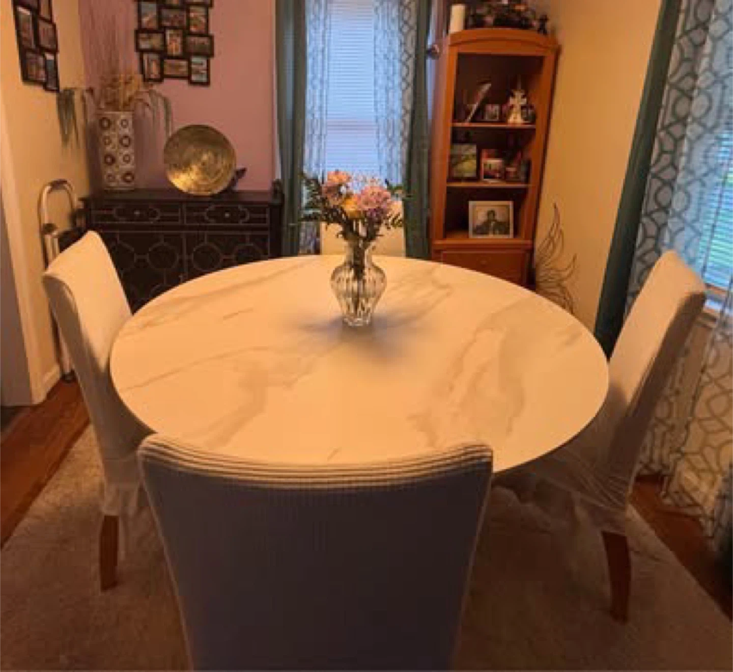 The dimensions are approximately 54"W x 54"D x 30"H. It comfortably seats up to four chairs. This table features a sintered stone top and a steel base. It was originally bought for $999