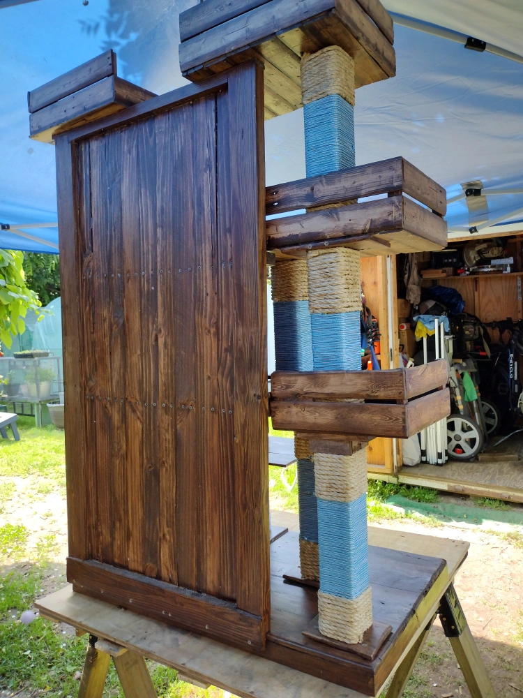 Check out this handmade wooden cat house It features multiple levels and scratching posts, providing plenty of space for your cat to play and relax. It's made of wood and rope.