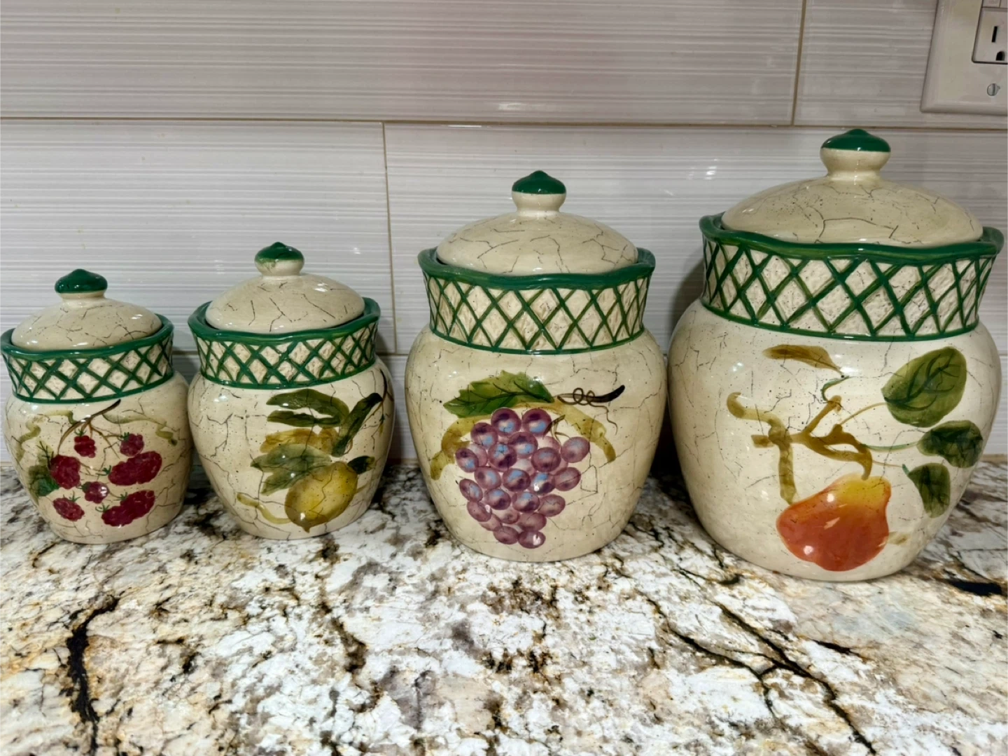 Buy & SellCeramic Kitchen Canister Set (4)Ceramic Kitchen Canister Set (4)$42Here's a set of four ceramic kitchen canisters! They feature a fruit design and a green lattice pattern around the top. Perfect for adding a touch of charm to your kitchen counter0 chats·0 favorites·5 viewsSELLERAmyWoodrow100 reviewsWHERE TO MEETCheck Location