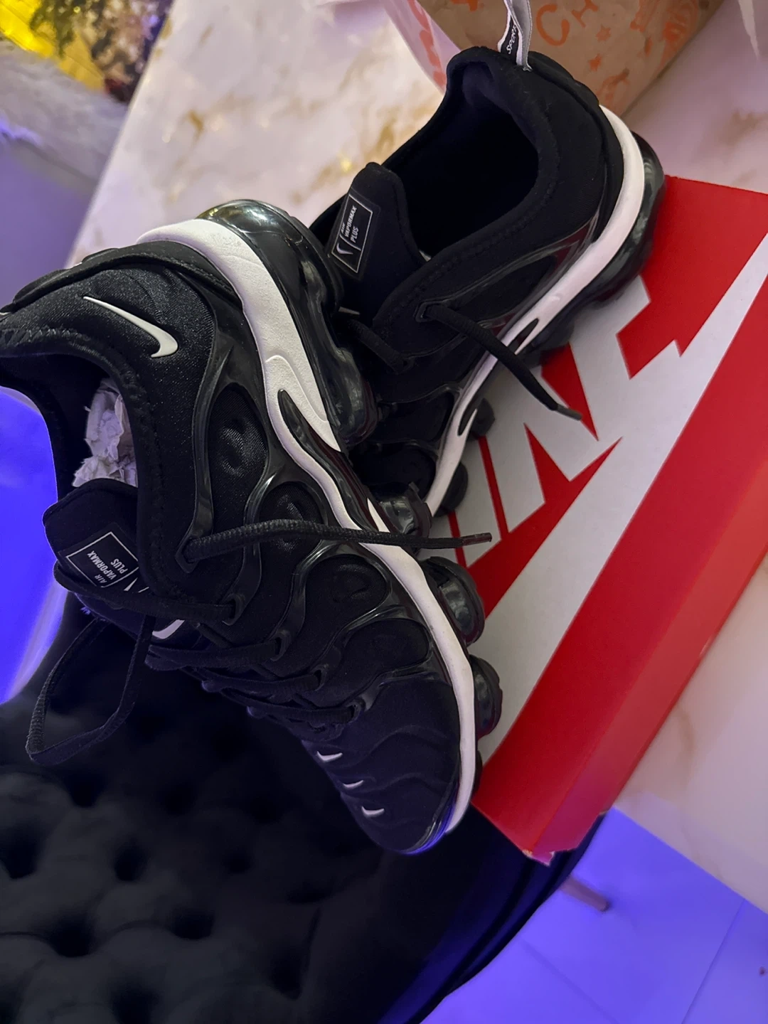 Selling a pair of Nike Air VaporMax Plus sneakers in black. These shoes feature the iconic VaporMax cushioning for all-day comfort and a stylish design. They are in great condition and come with the original box.