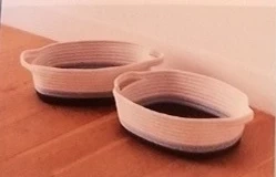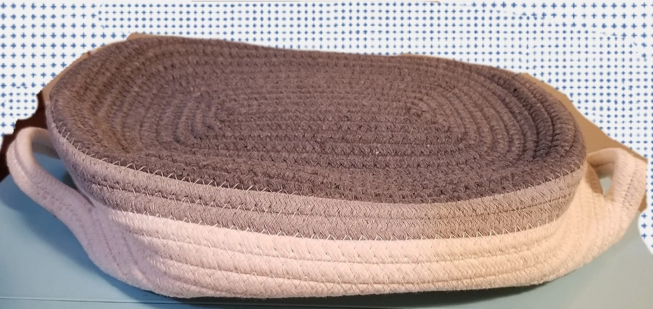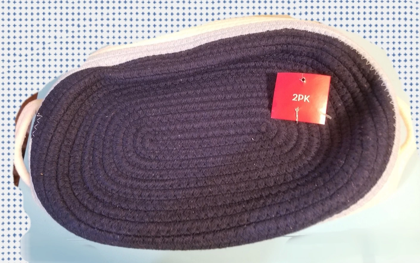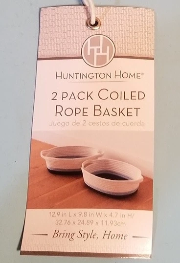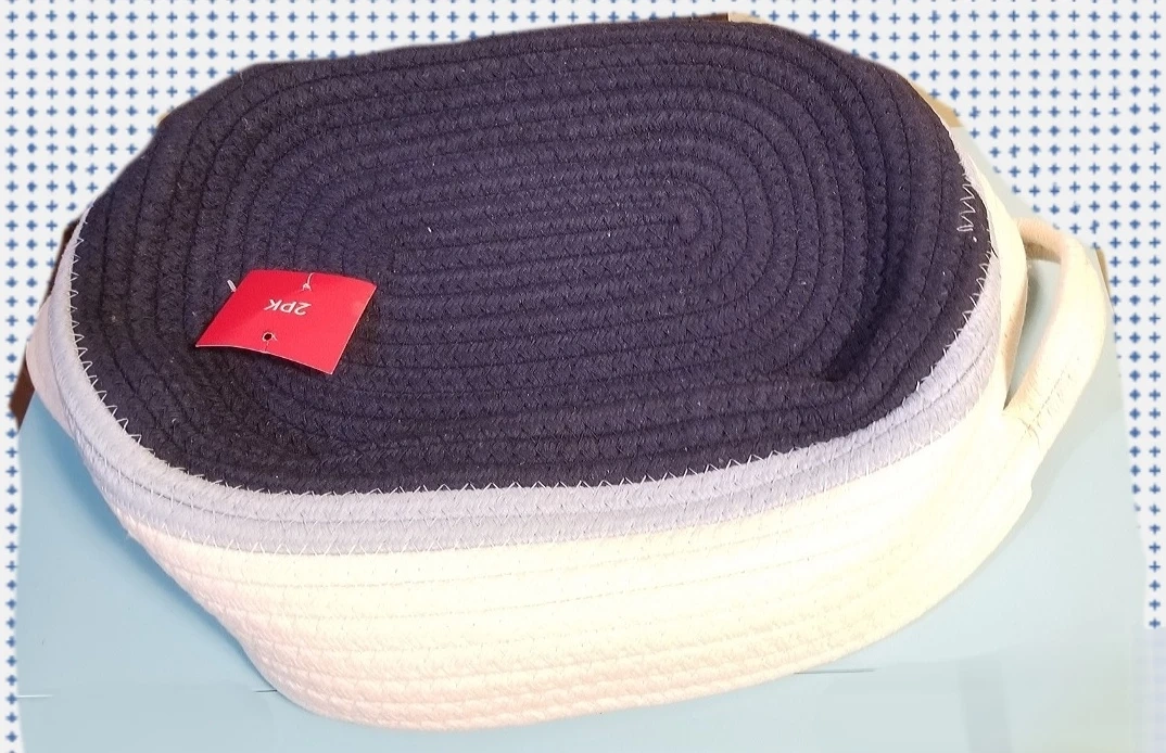 I'm selling a Huntington Home 2-pack coiled rope basket. It features a stylish gray, white, Navy and white design.