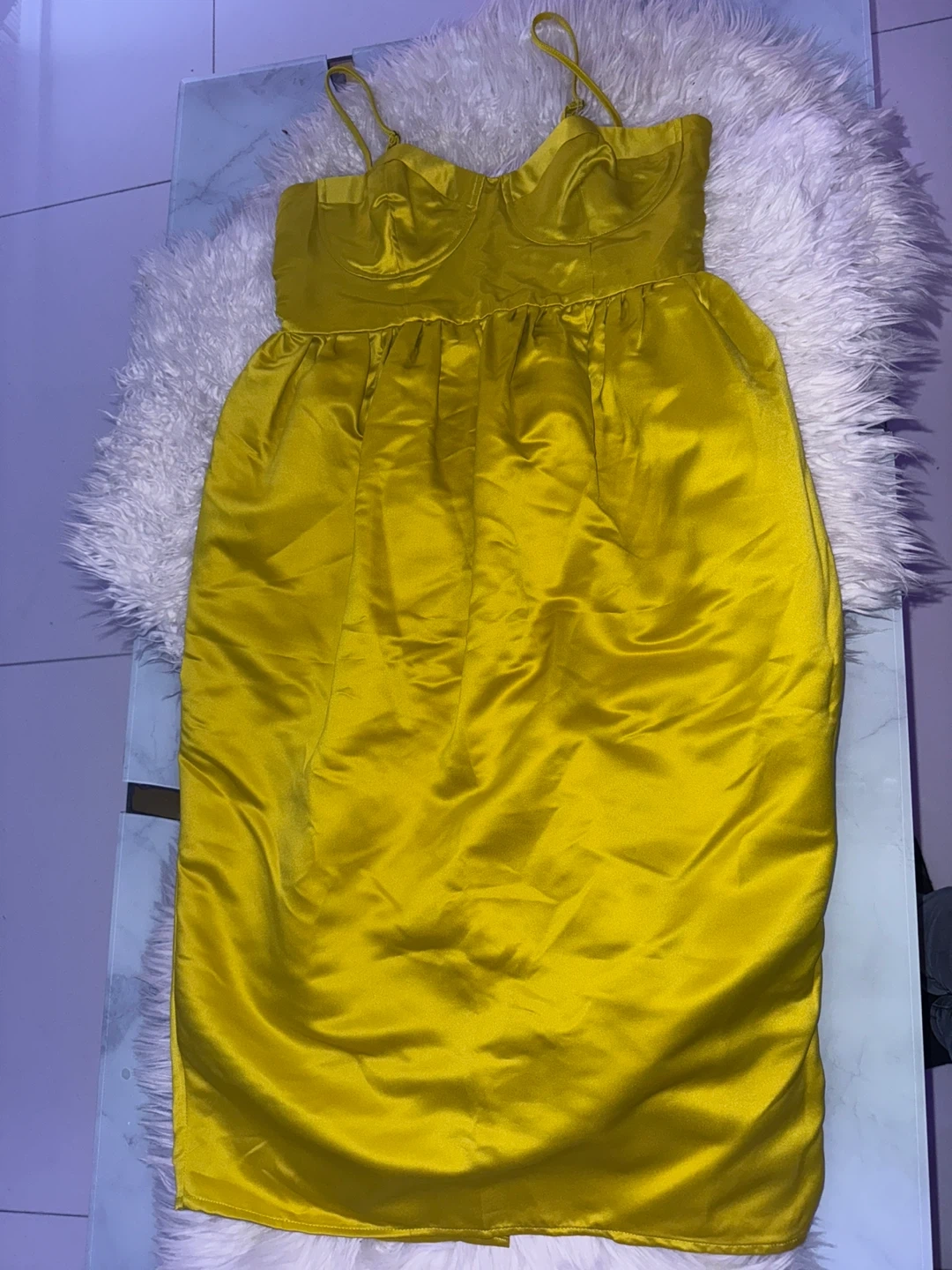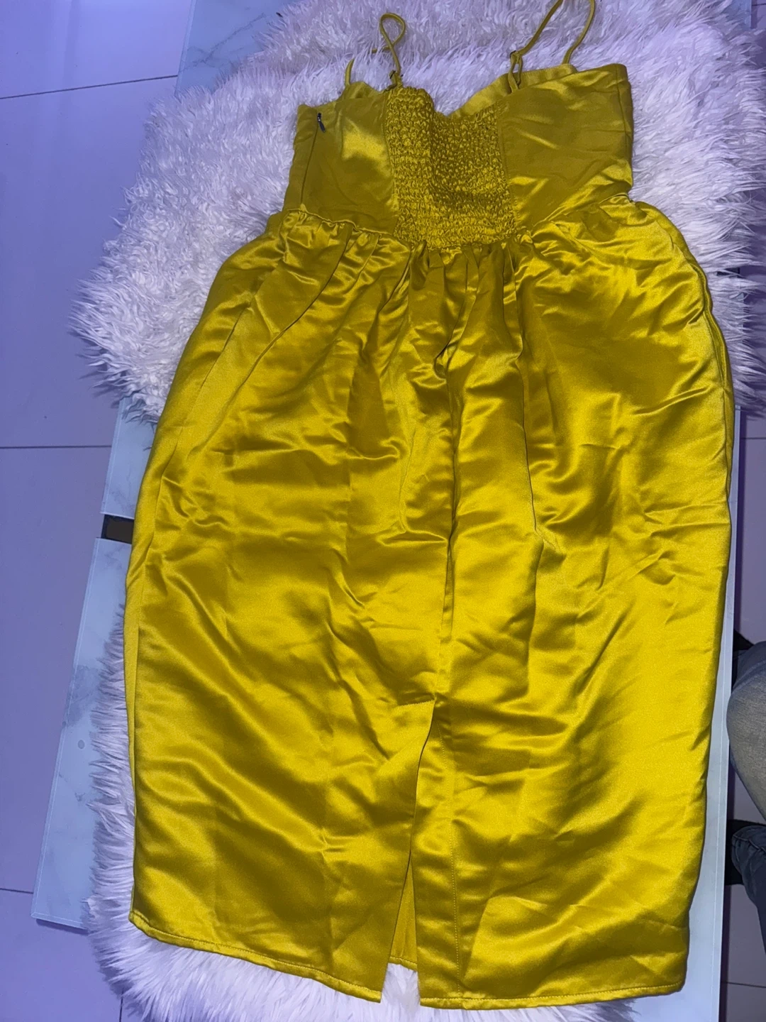 Selling a beautiful yellow dress from Future Collective in size M! It's in great condition and ready for a new home. The dress features a smocked bodice and a silky skirt, perfect for a special occasion or a night out