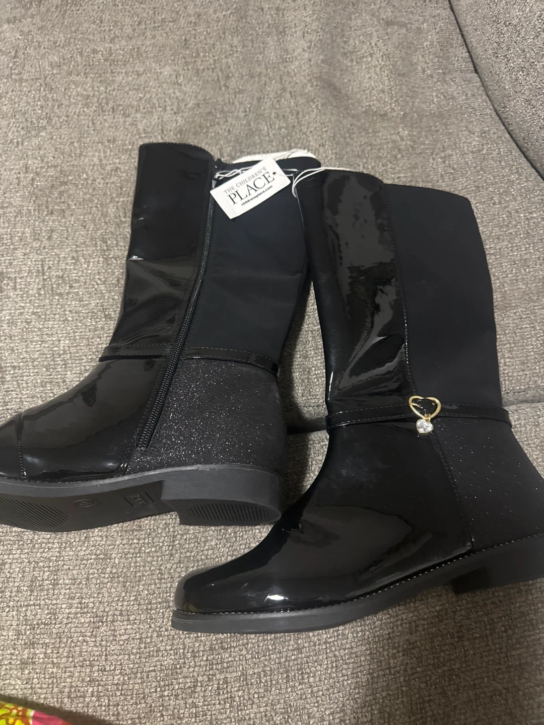 These are a pair of black boots from The Children's Place! They feature a shiny, patent-leather-like material on the foot and a softer, fabric-like material on the upper part of the boot. There's also a cute little heart charm on the side! BOOT SIZE-6