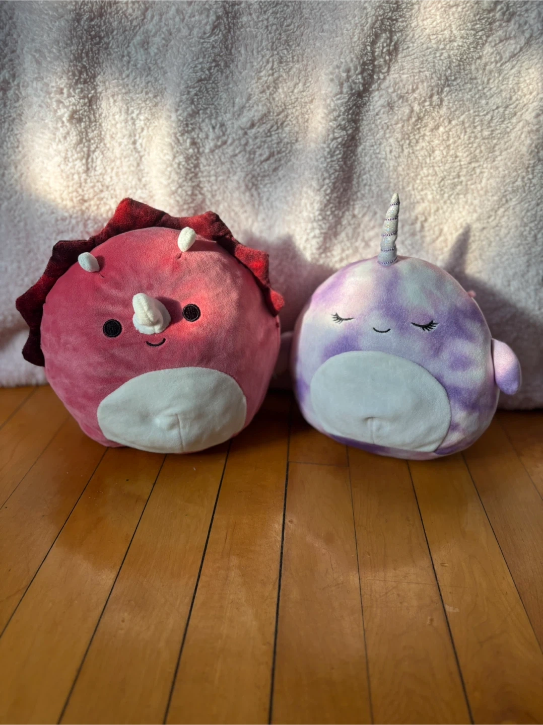 Selling two adorable Squishmallows plushies! One is a pink dinosaur with a red patterned frill, and the other is a purple and white narwhal with closed eyes. They're both in great condition and ready for a new home
