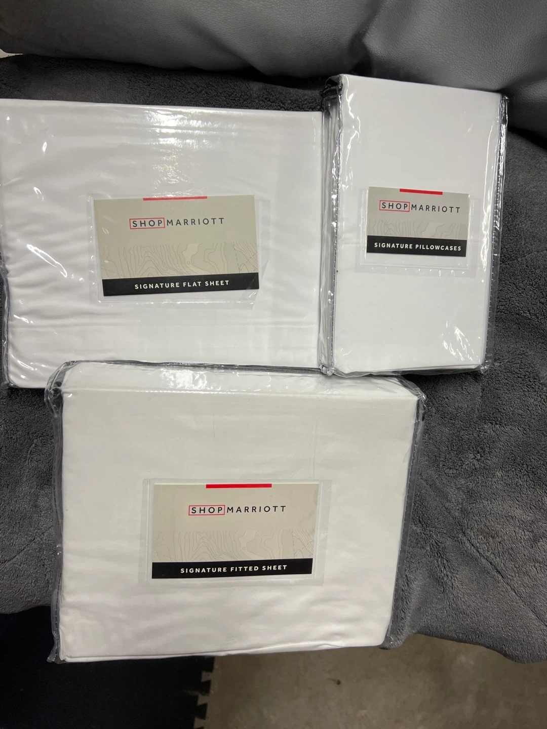 Selling a brand new Shop Marriott King Size sheet set! Includes a signature flat sheet, signature fitted sheet, and signature pillowcases. All items are still in their original packaging and have never been opened. Perfect for adding a touch of luxury to your bedroom!