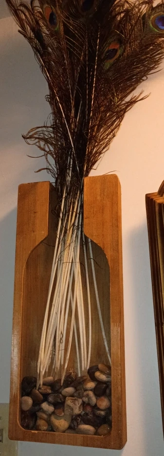 Unique wooden vase with a bottle-shaped cutout. I filled it with decorative stones and peacock feathers. (not included) But you can do your own special arrangement to compliment your style.