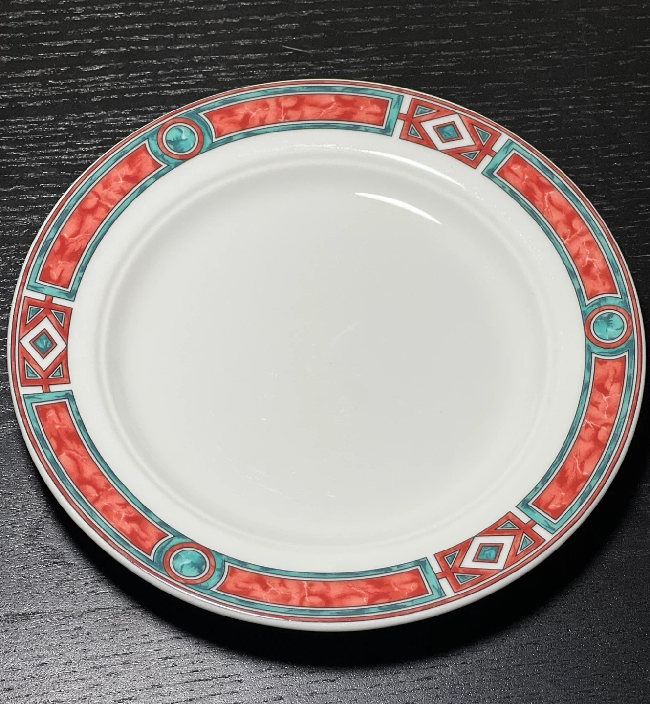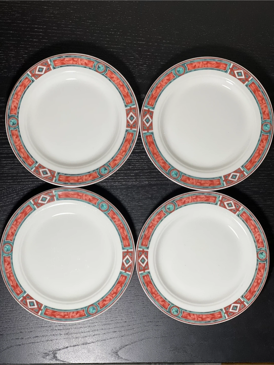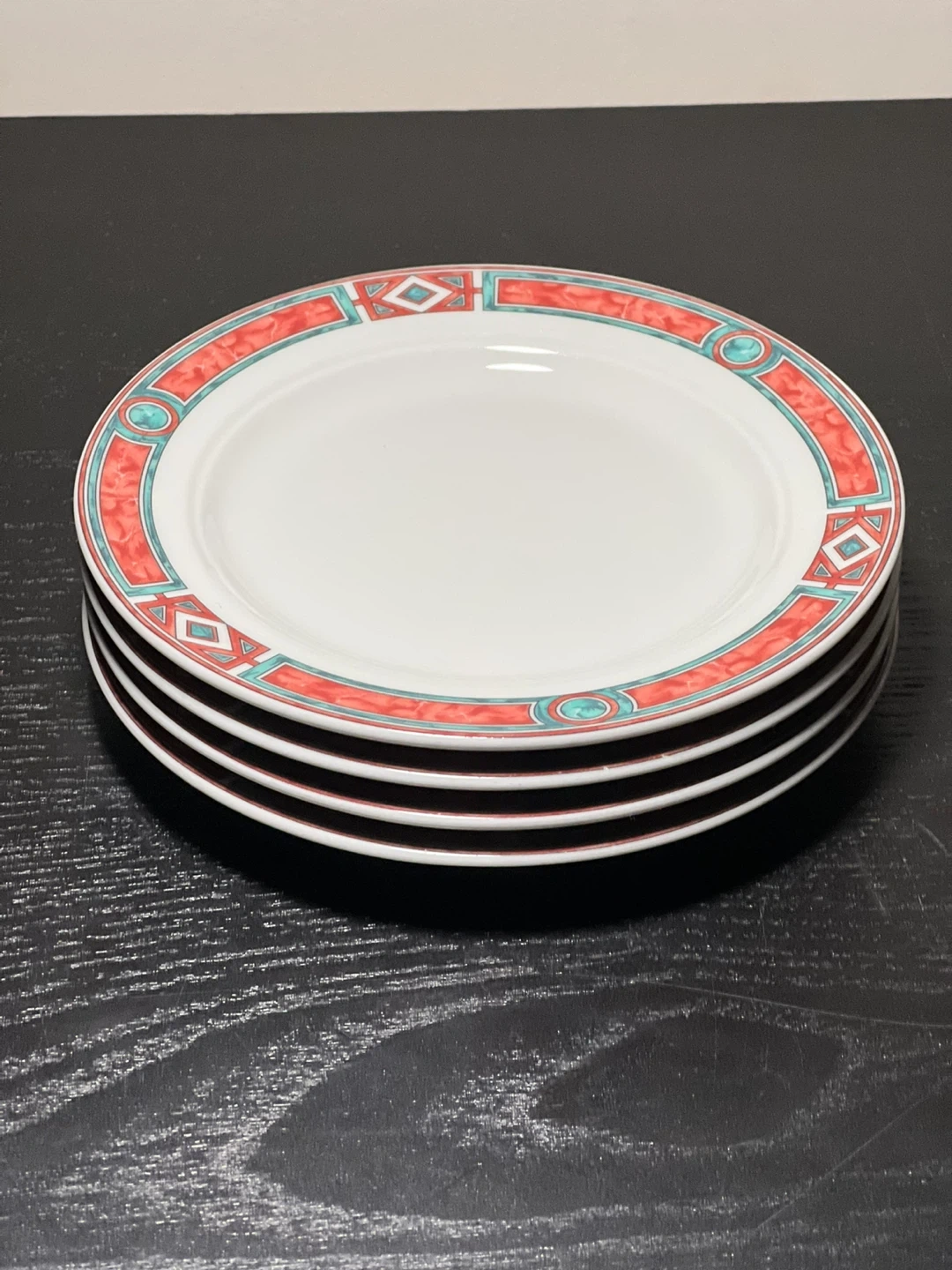 The plates are from the Rialto pattern by Villeroy & Boch. This design features a white center with a wide border of red/coral and turquoise geometric patterns, often described as having "Argento, Red & Green Sections, Smooth".