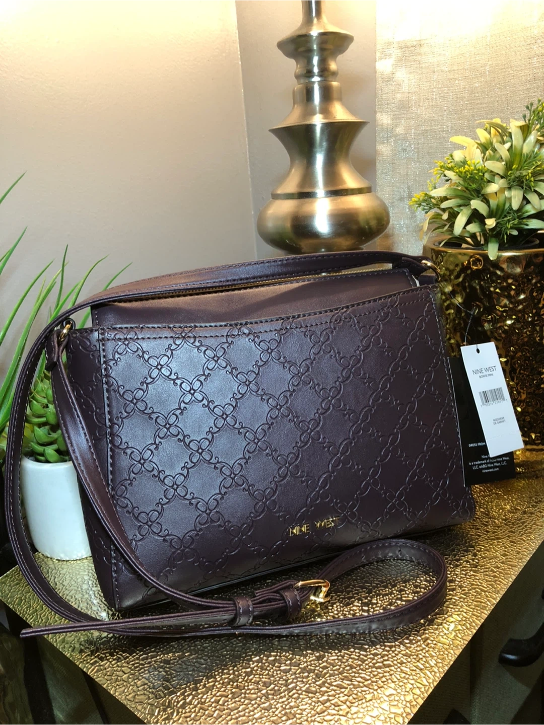 This is a stylish Nine West crossbody bag in a lovely shade of brown! It's perfect for carrying your essentials while keeping your hands free. The bag features a unique embossed pattern and a comfortable adjustable strap
