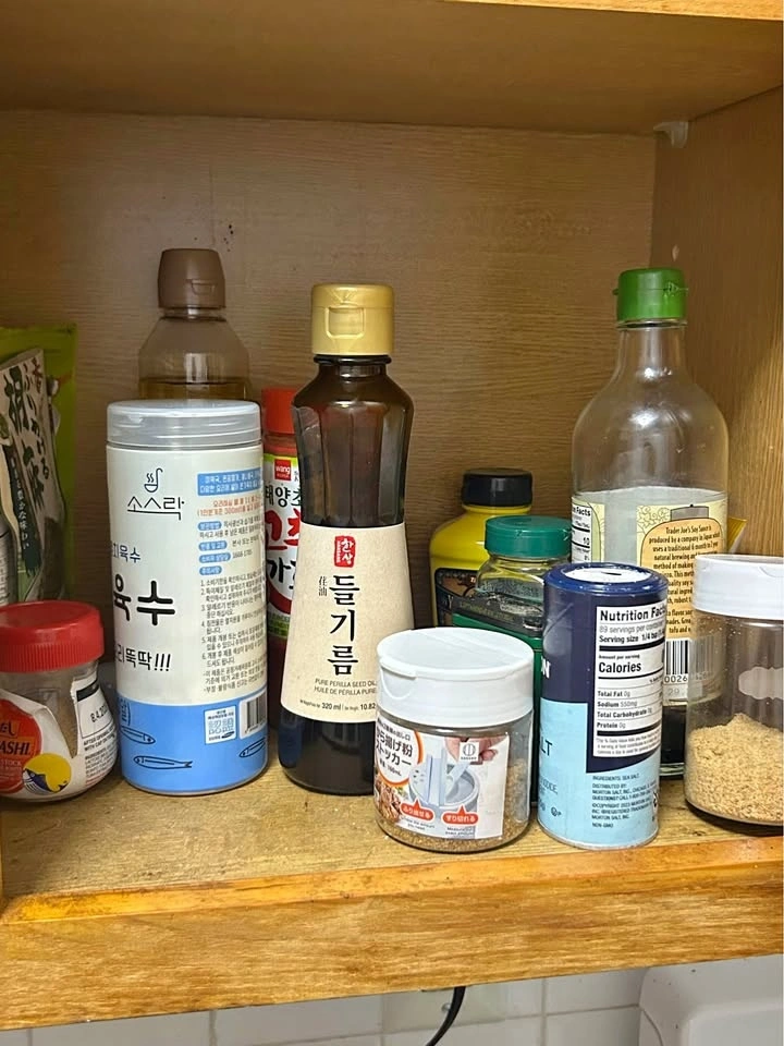 Salt, pepper, sugar, yellow mustard, red pepper, gochugaru (Korean chili flakes), Dashida seasoning, perilla oil, vinegar, anchovy stock, Hondashi, honey, Japanese miso paste, gochujang (Korean chili paste), Japanese curry cubes, grapefruit syrup, mayonnaise, tonkatsu sauce, ponzu sauce, oyster sauce, ketchup, peanut butter, Japanese ramen, seaweed, black bean sauce powder, somen noodles, and soba noodles.