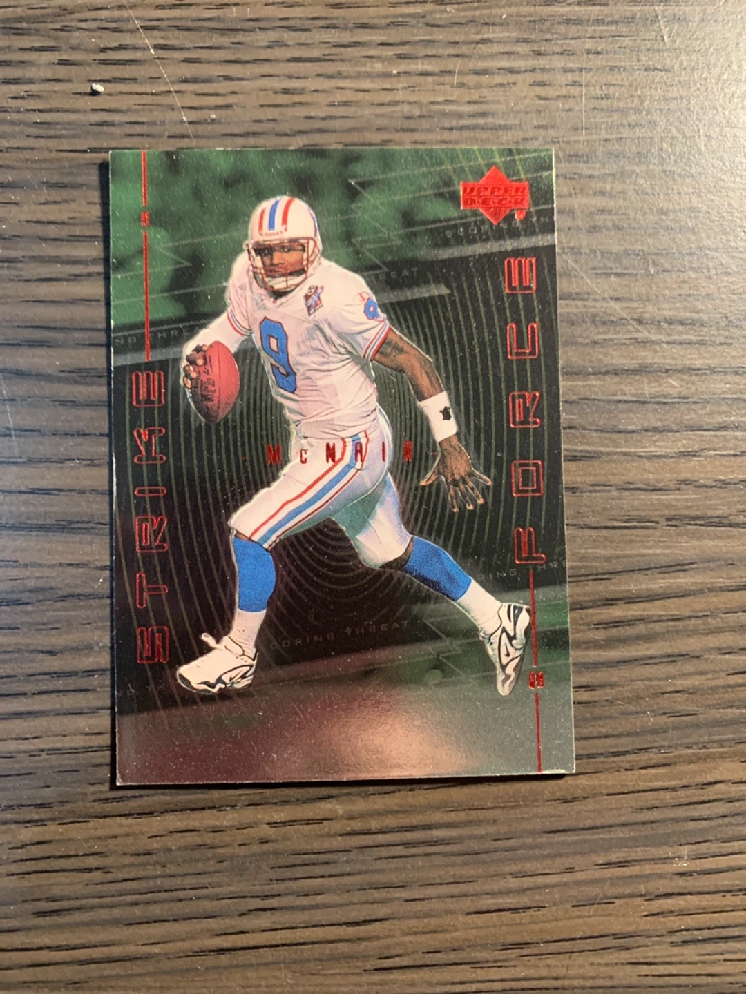 Selling a Steve McNair Strike Force football card featuring the Tennessee Titans. The card highlights stats from the 1998 football season, including passing yards, completion percentage, QB rating, and rushing yards. A great collectible for any football fan!