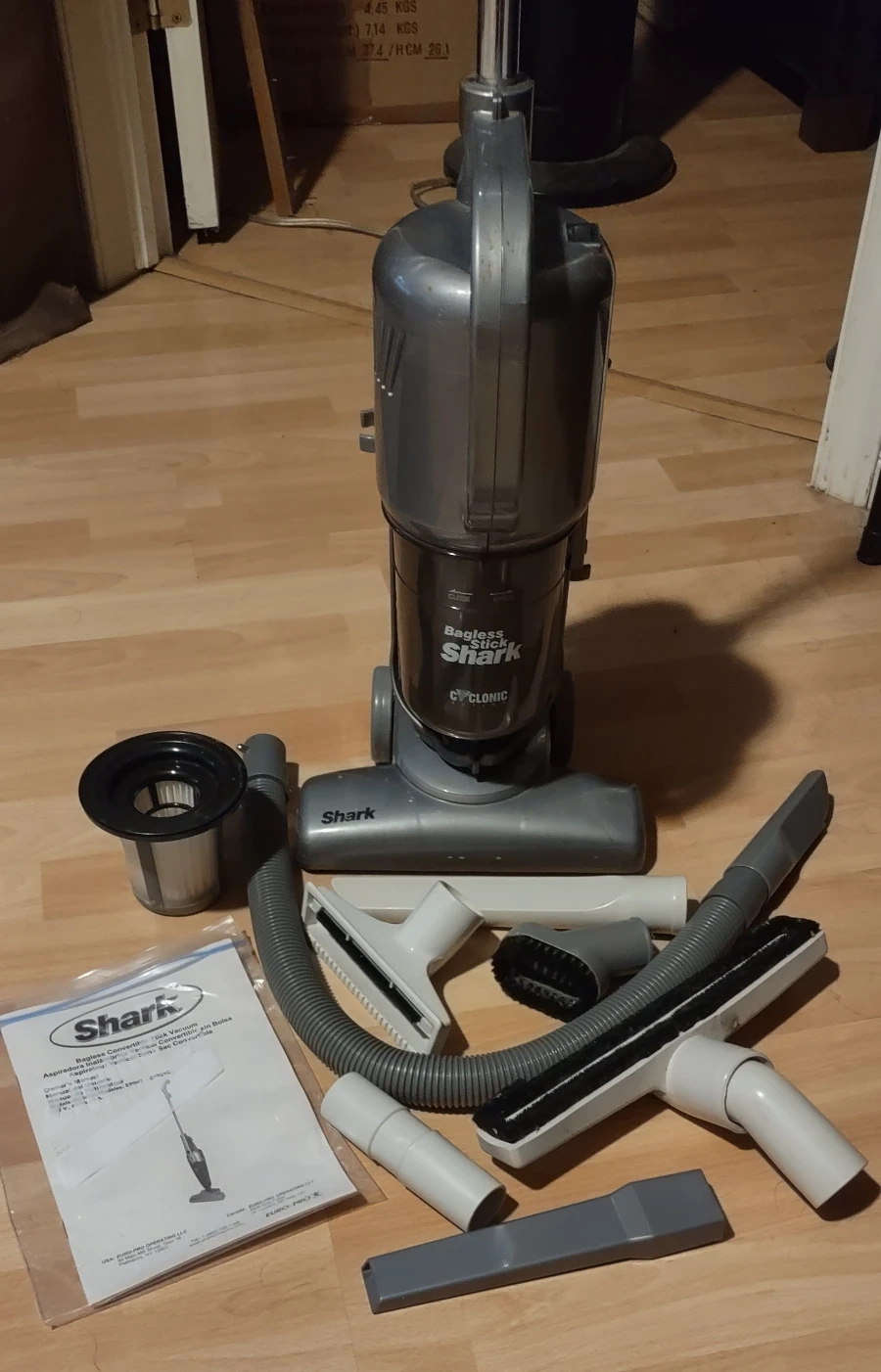 Selling a Shark bagless stick vacuum cleaner. It comes with all the attachments pictured, including the hose, brush heads, and 2 filters. The manual is also included. Perfect for quick cleanups around the house