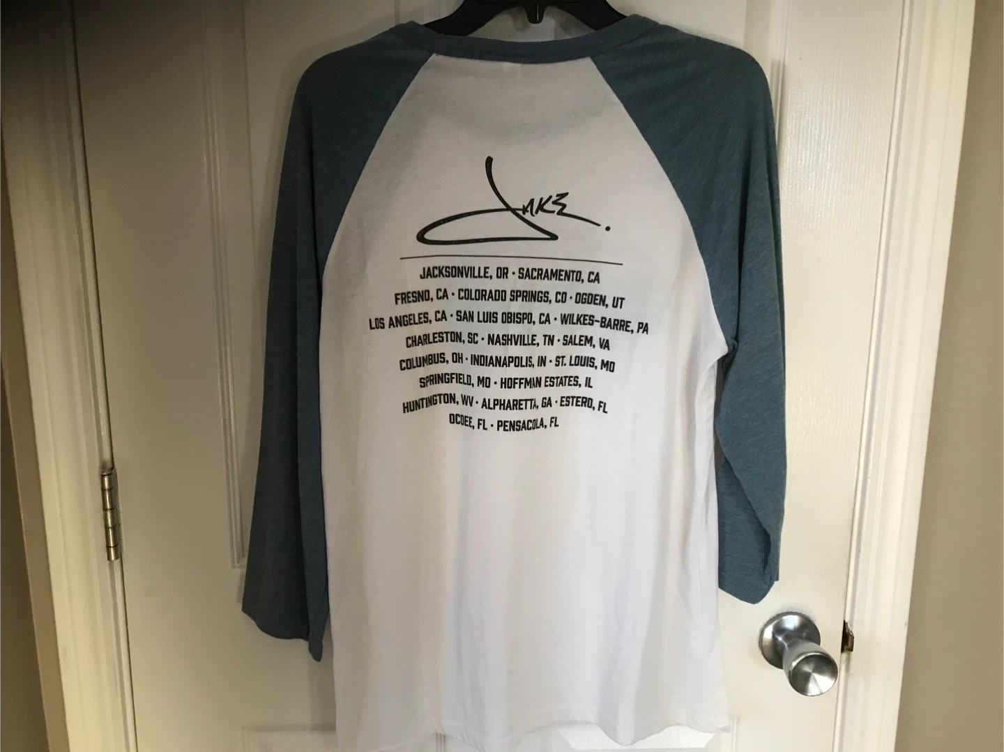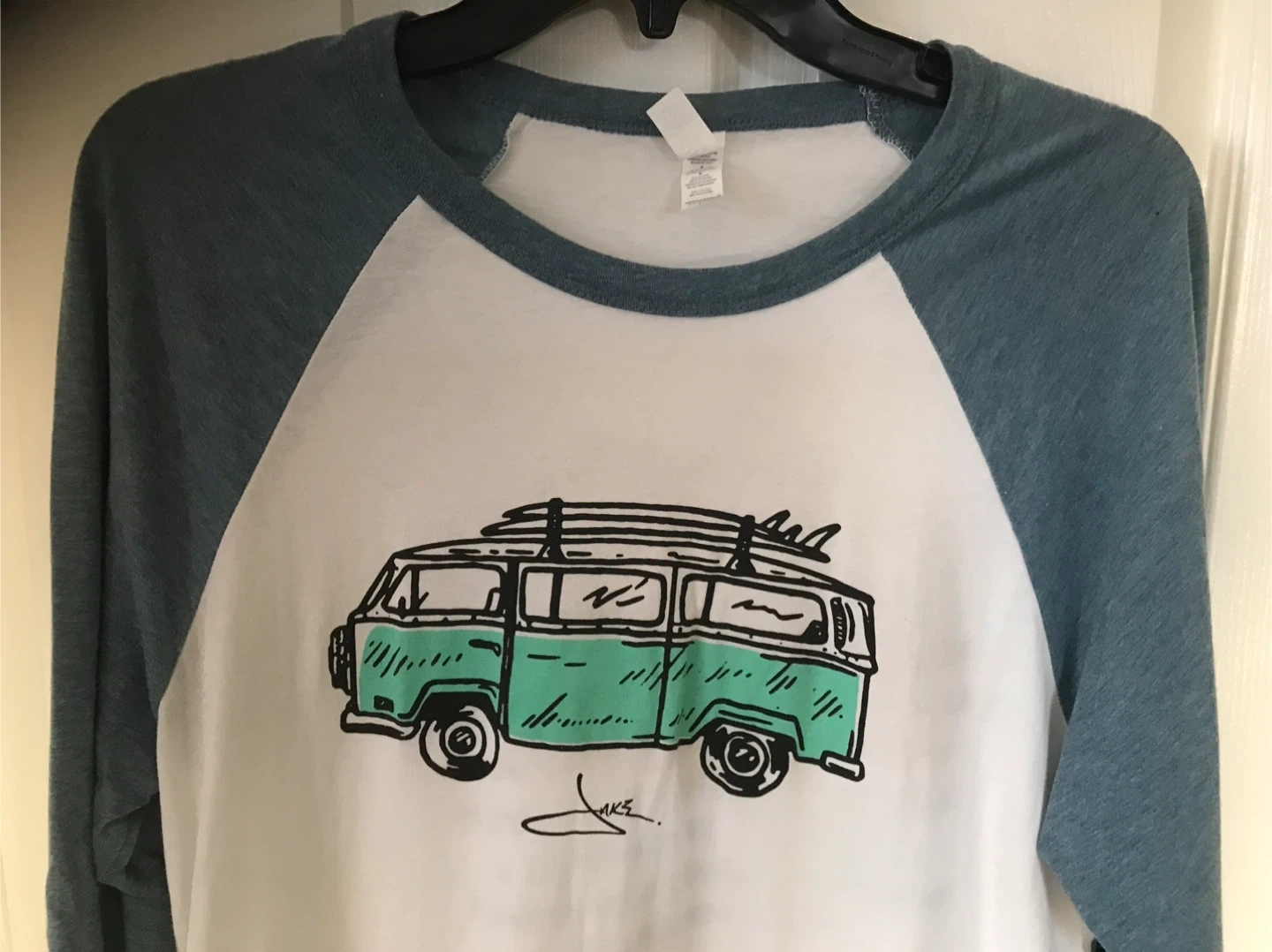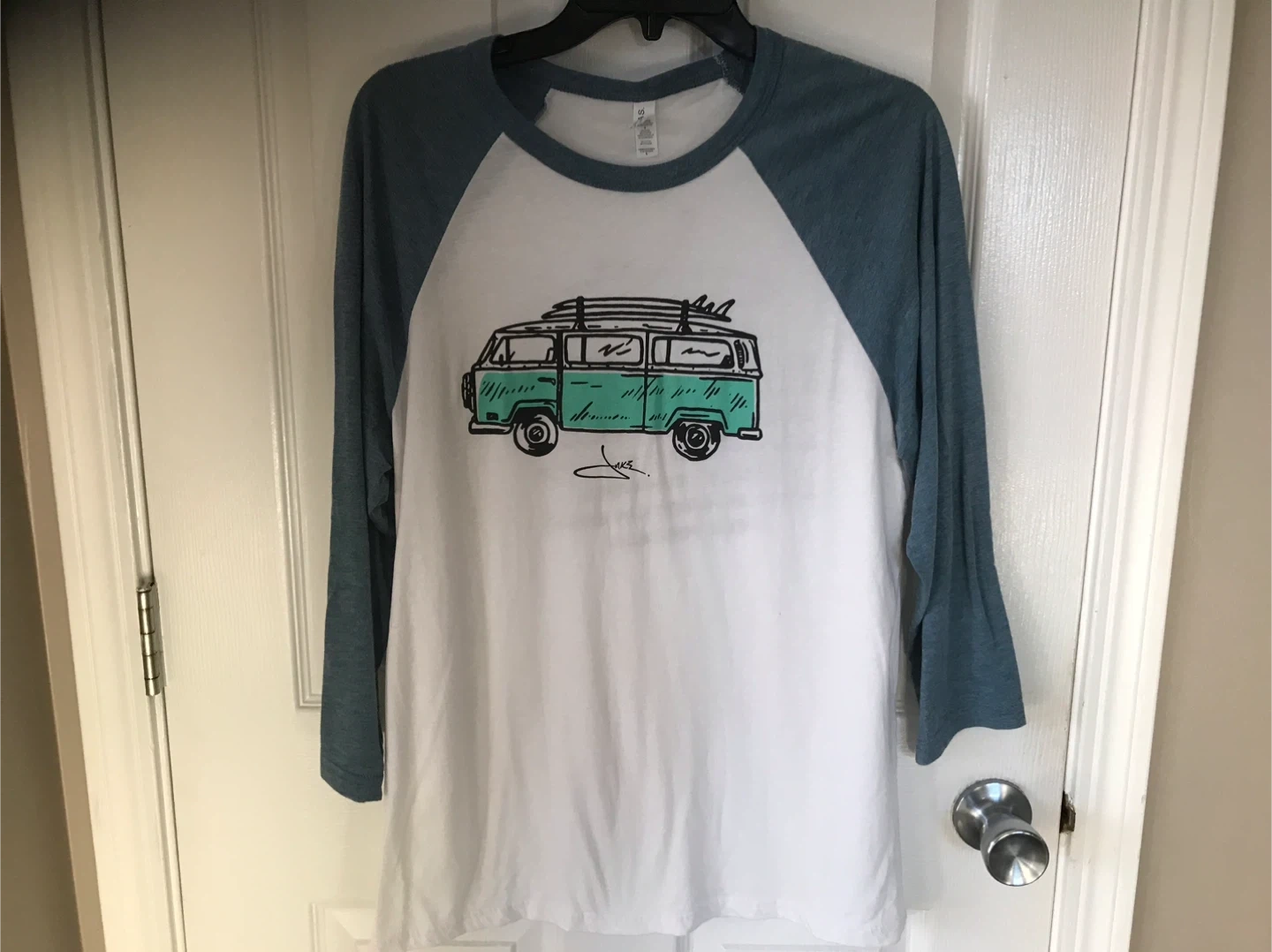 Cool raglan tee with a surf van graphic! It's a size large and features a teal van with surfboards on top. The sleeves are a heathered teal color. The back has a list of cities.