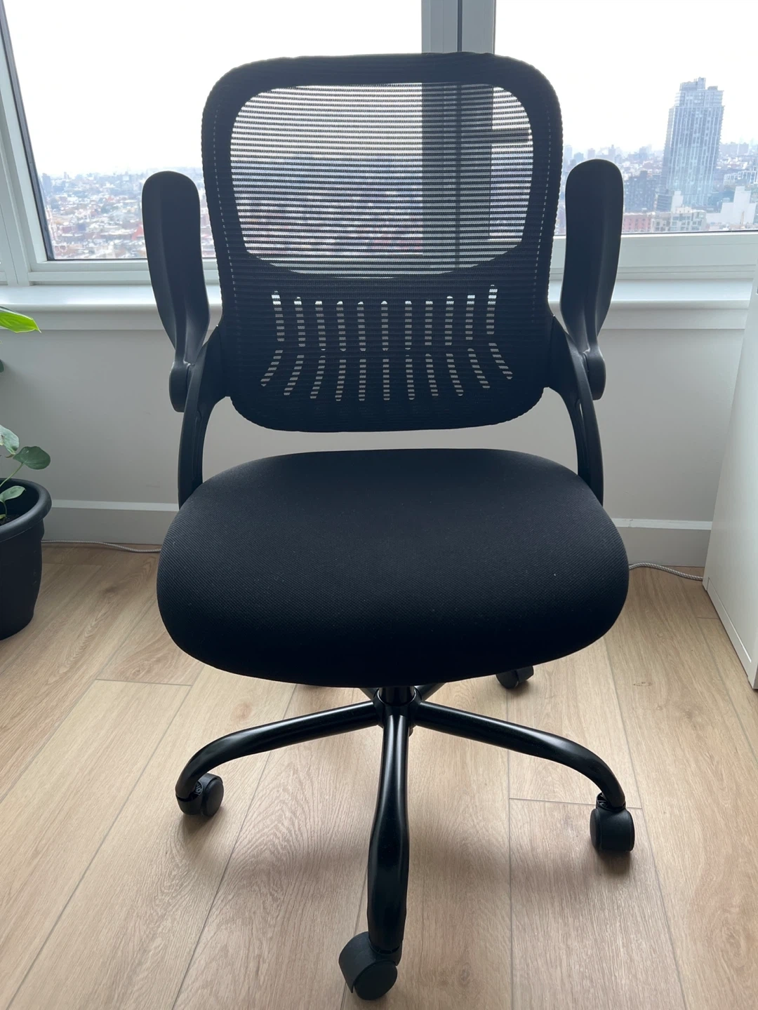 Selling a comfortable black office chair! It features a mesh back for breathability and adjustable arms for customized support. Perfect for your home office or study space. It's in great condition and ready for a new home
