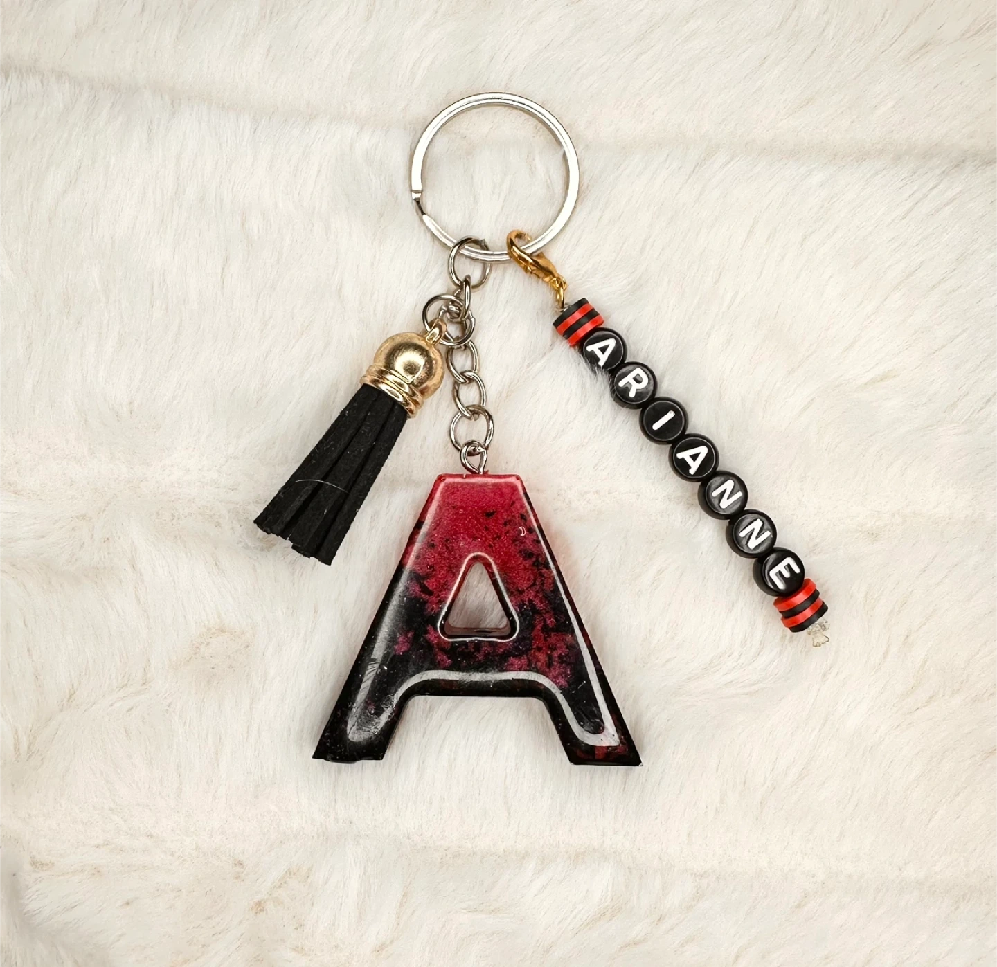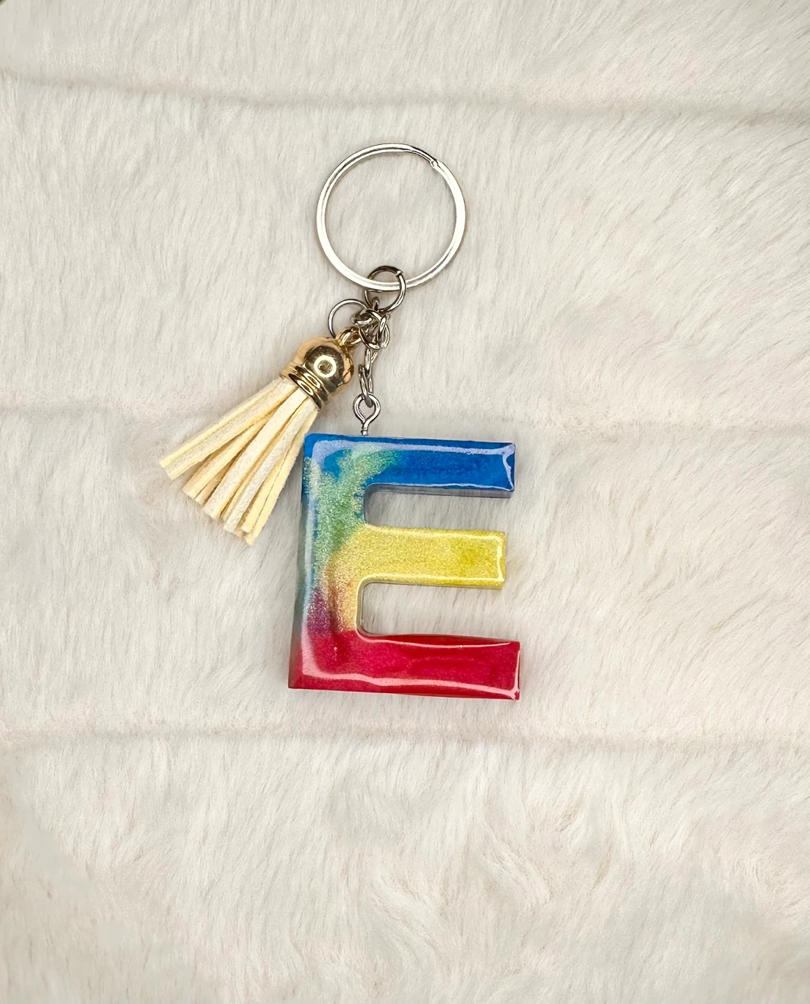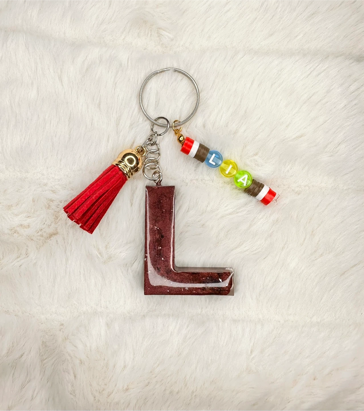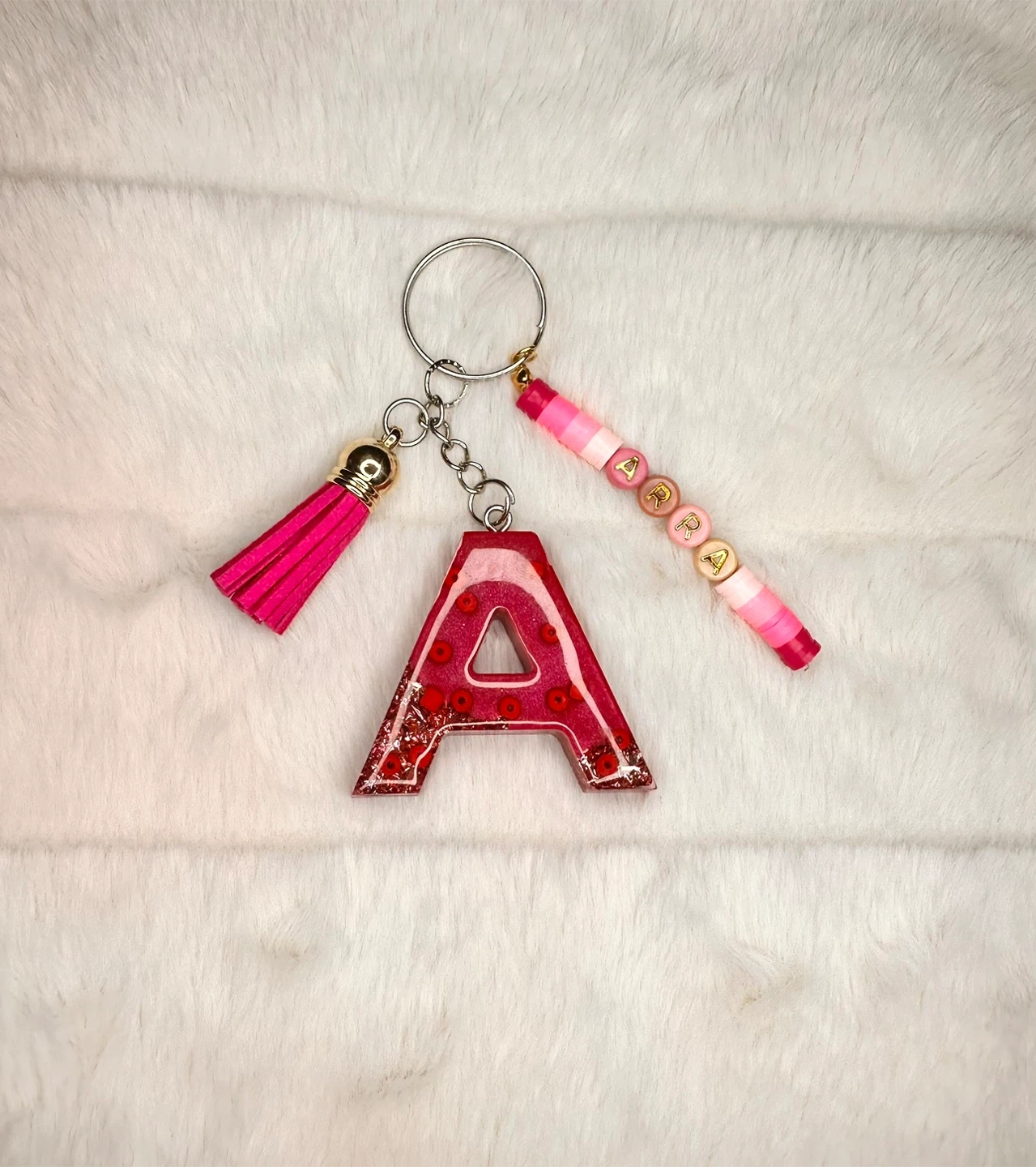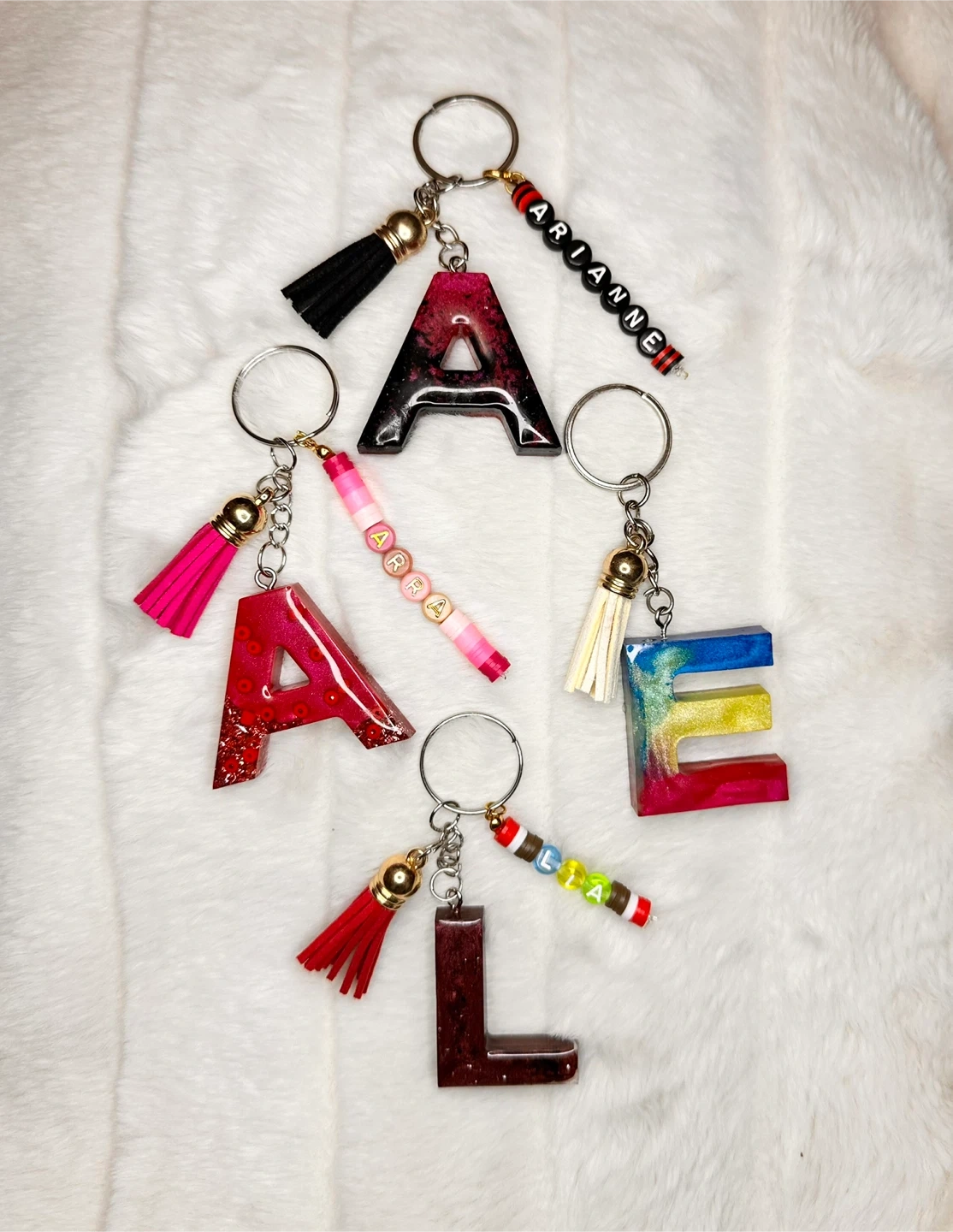 Check out these adorable handmade resin initial keychains! Each one features a unique design with a tassel and personalized name beads. Perfect for adding a personal touch to your keys or bag.