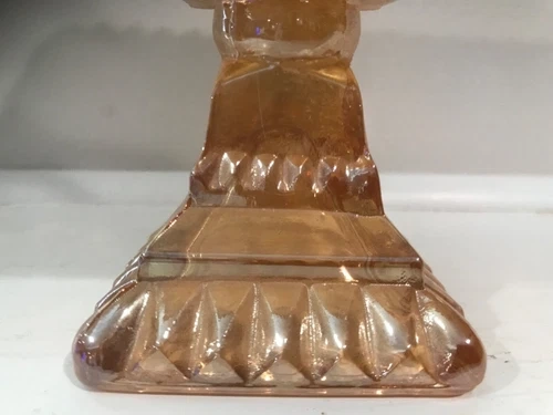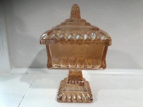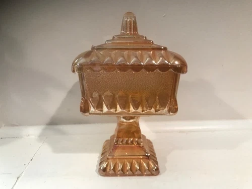 This vintage Jeannette orange carnival glass square pedestal jar/candy dish is a stunning addition to any collection. The glass-making technique used is fused, giving it a glossy finish that complements the mid-century modern style perfectly. The dish has a capacity of 8 oz and comes with a lid. The dish is made of high-quality glass material and features a beautiful orange color. It is an original vintage piece from the 1940s/1950s/1960s production style of carnival glass. This candy dish is perfect for use as a decorative item or for serving candies and other small treats.