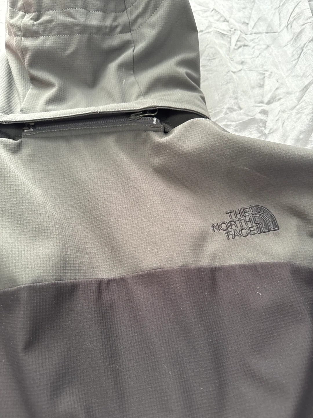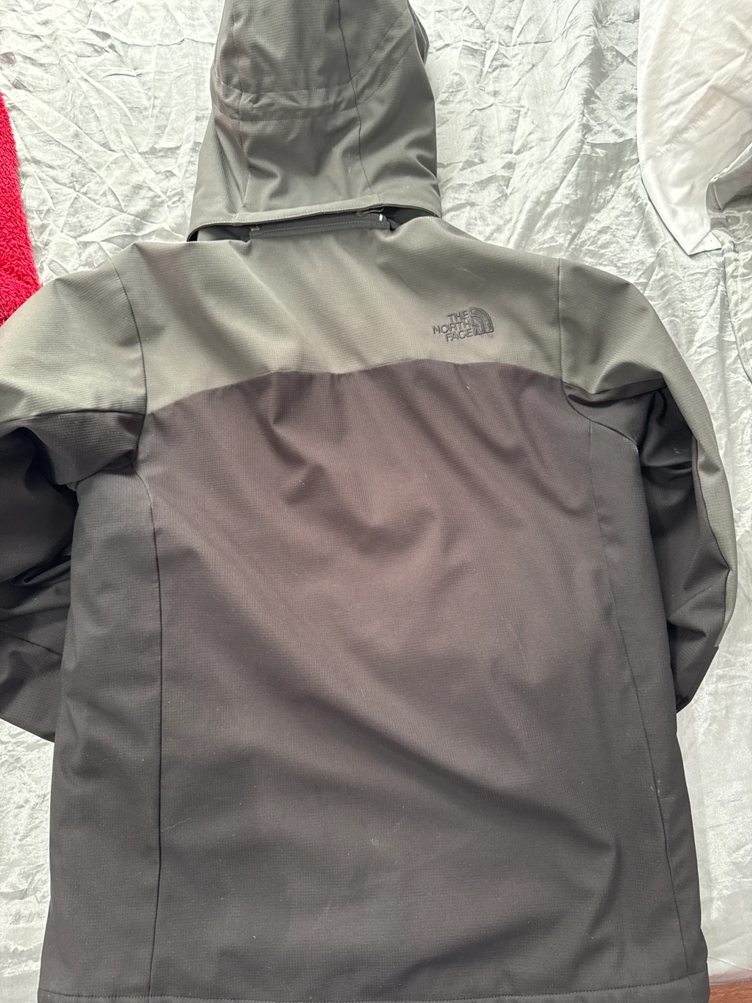 Selling a The North Face jacket in gray and black. It's a size small. The jacket is made of 100% polyester shell and 100% nylon lining and insulation.