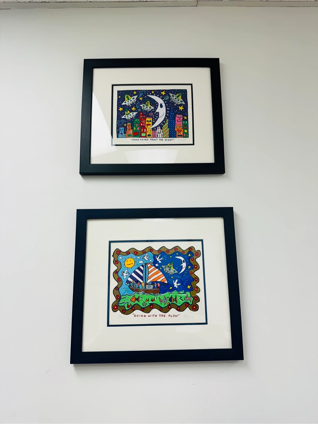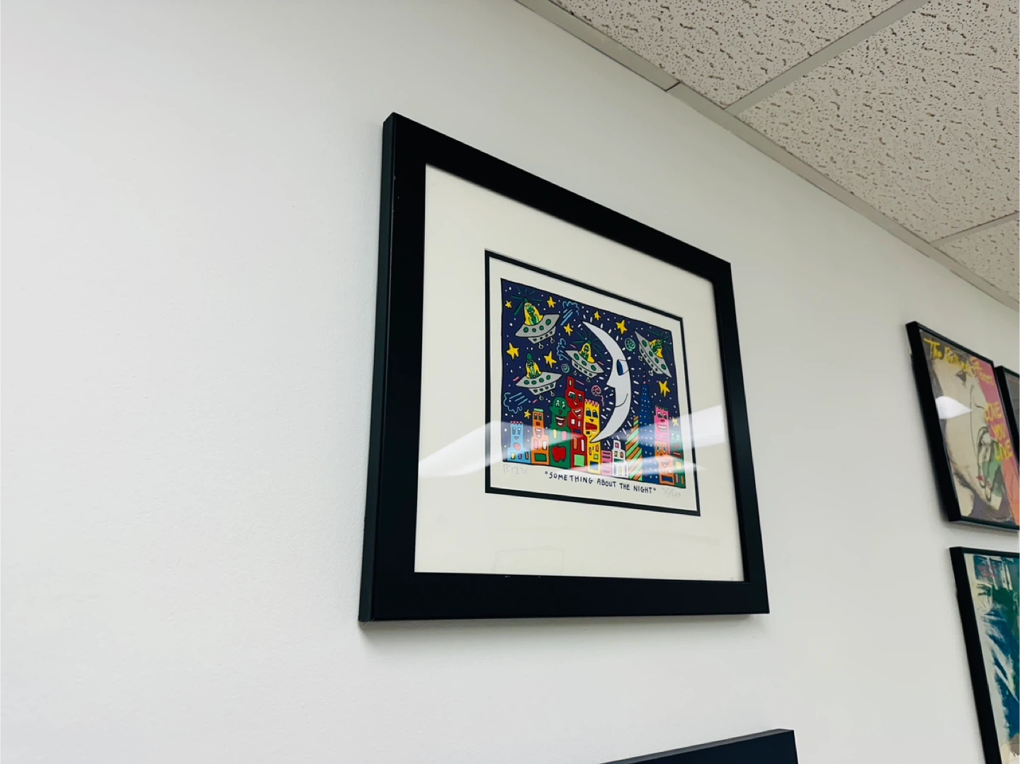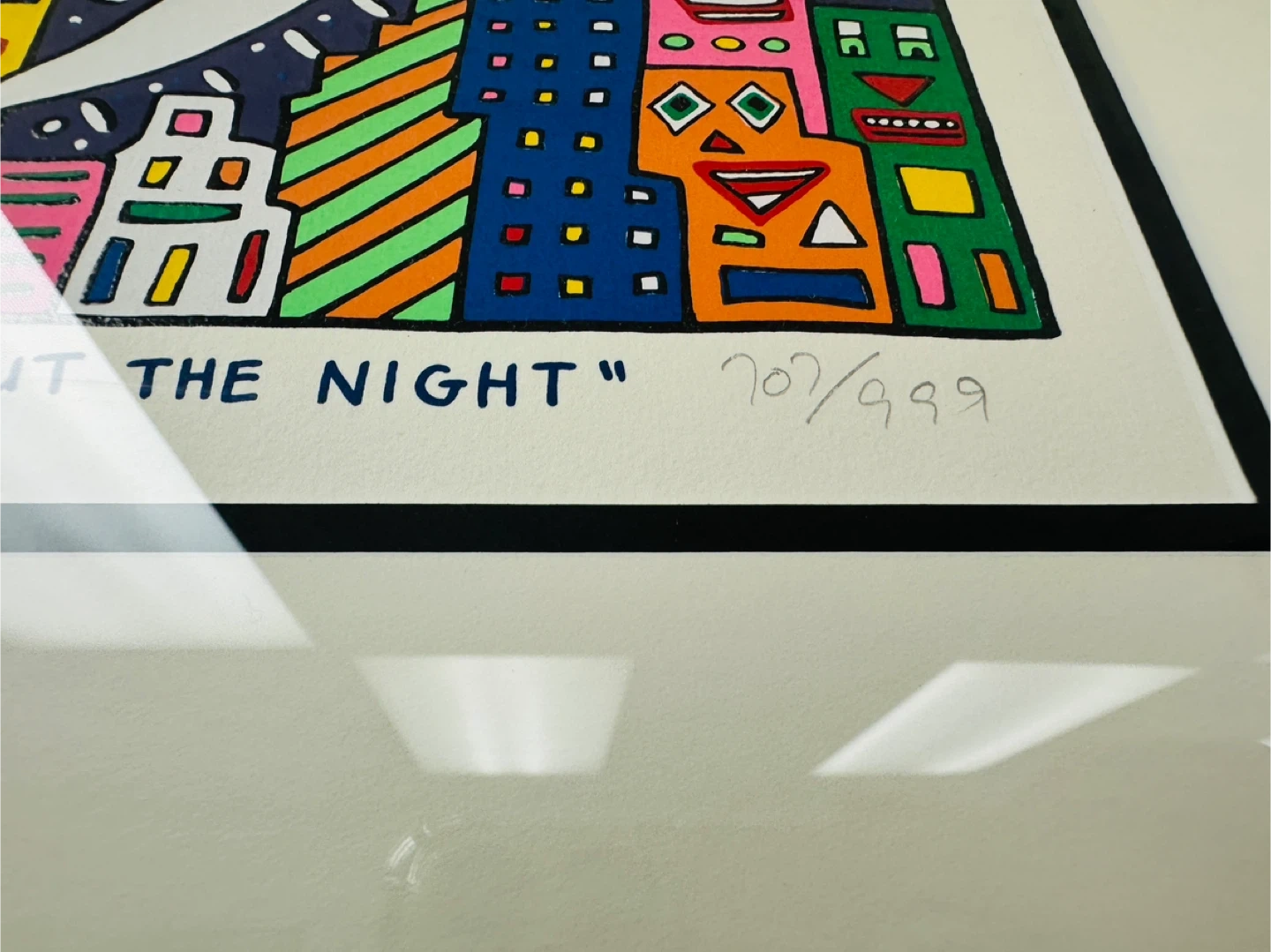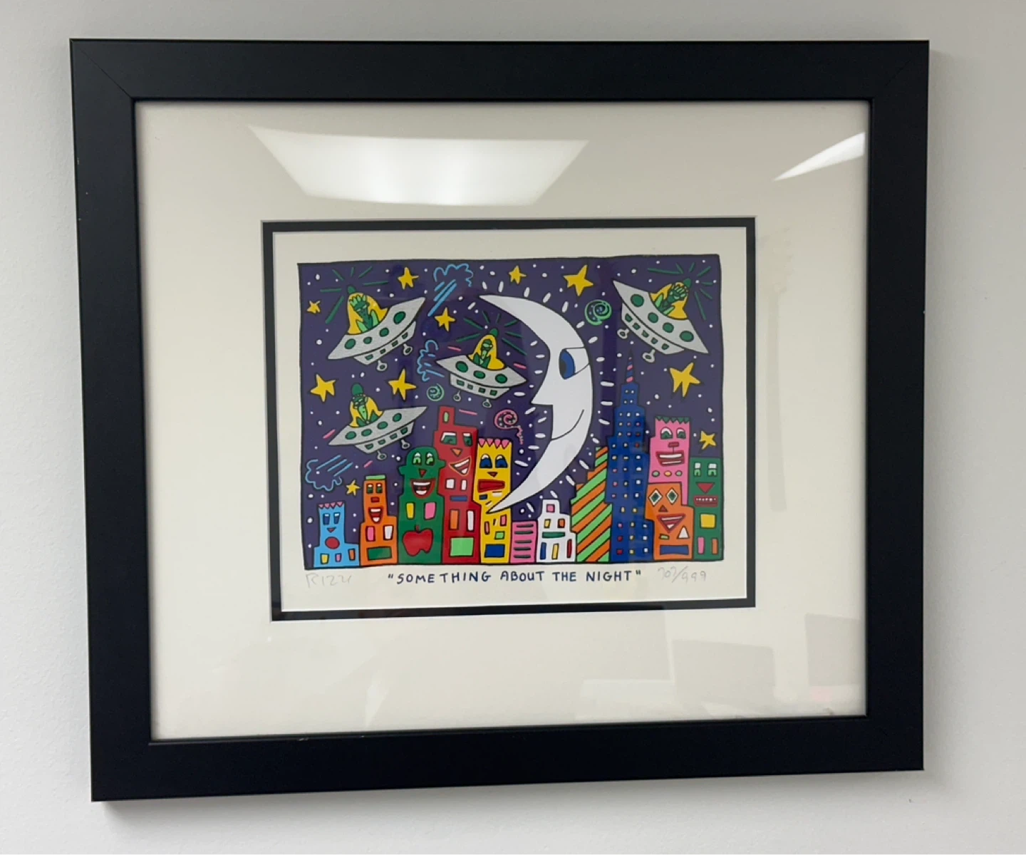 Selling a framed art print titled "Something About the Night"! It features a colorful cityscape with a crescent moon and UFOs against a dark blue background. Signed by the artist and numbered 707/999.