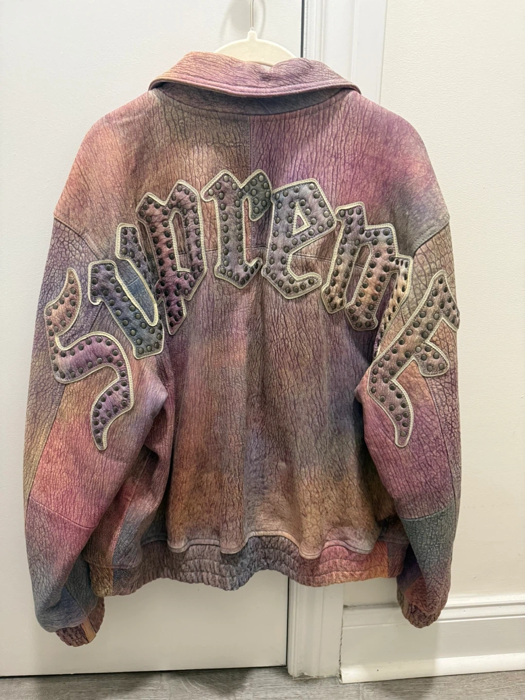 Selling a Supreme Studded Collar Leather Jacket in size M. It features a unique studded design on the collar and back. The jacket has a button closure and a quilted lining. The color is a mix of pink, purple, and yellow. Perfect for adding a stylish edge to any outfit