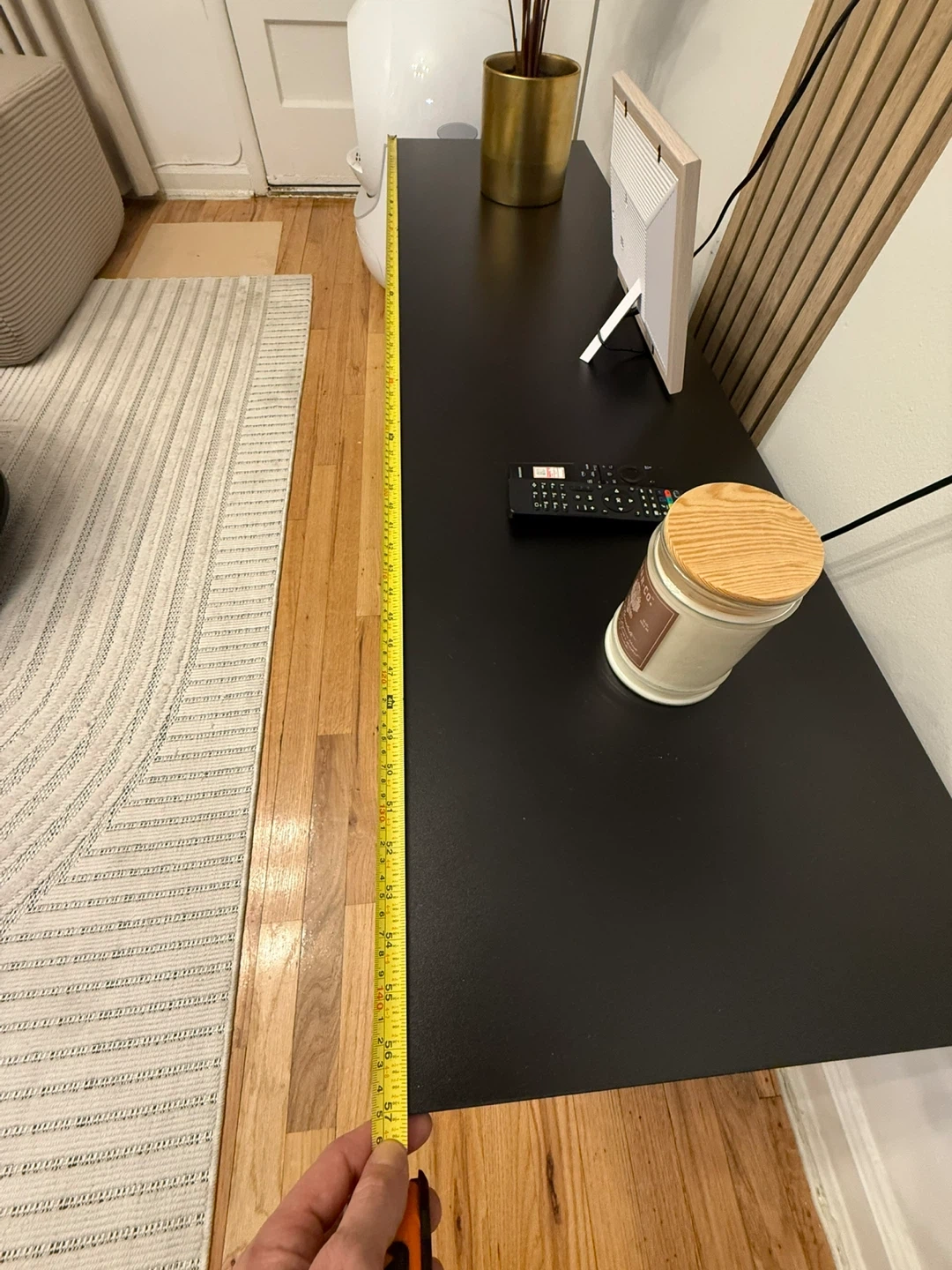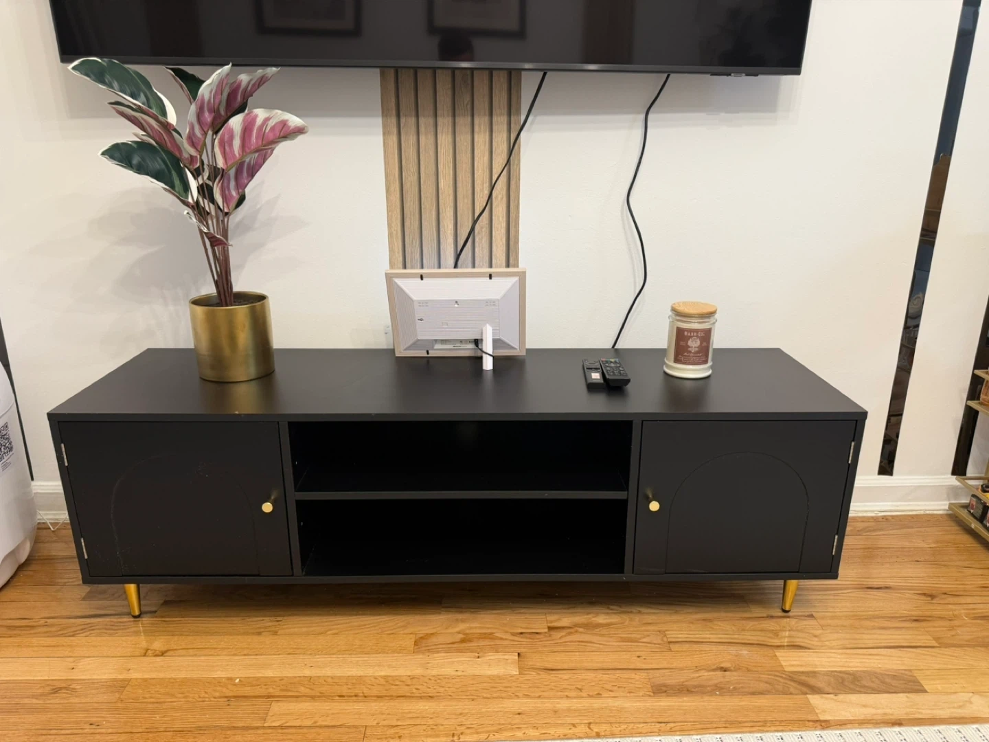 Selling a stylish black TV stand. It's in great condition and perfect for any living room setup. The unit features two doors and an open shelf in the middle, providing ample storage space. The top surface is spacious enough to accommodate a large TV and other media devices.