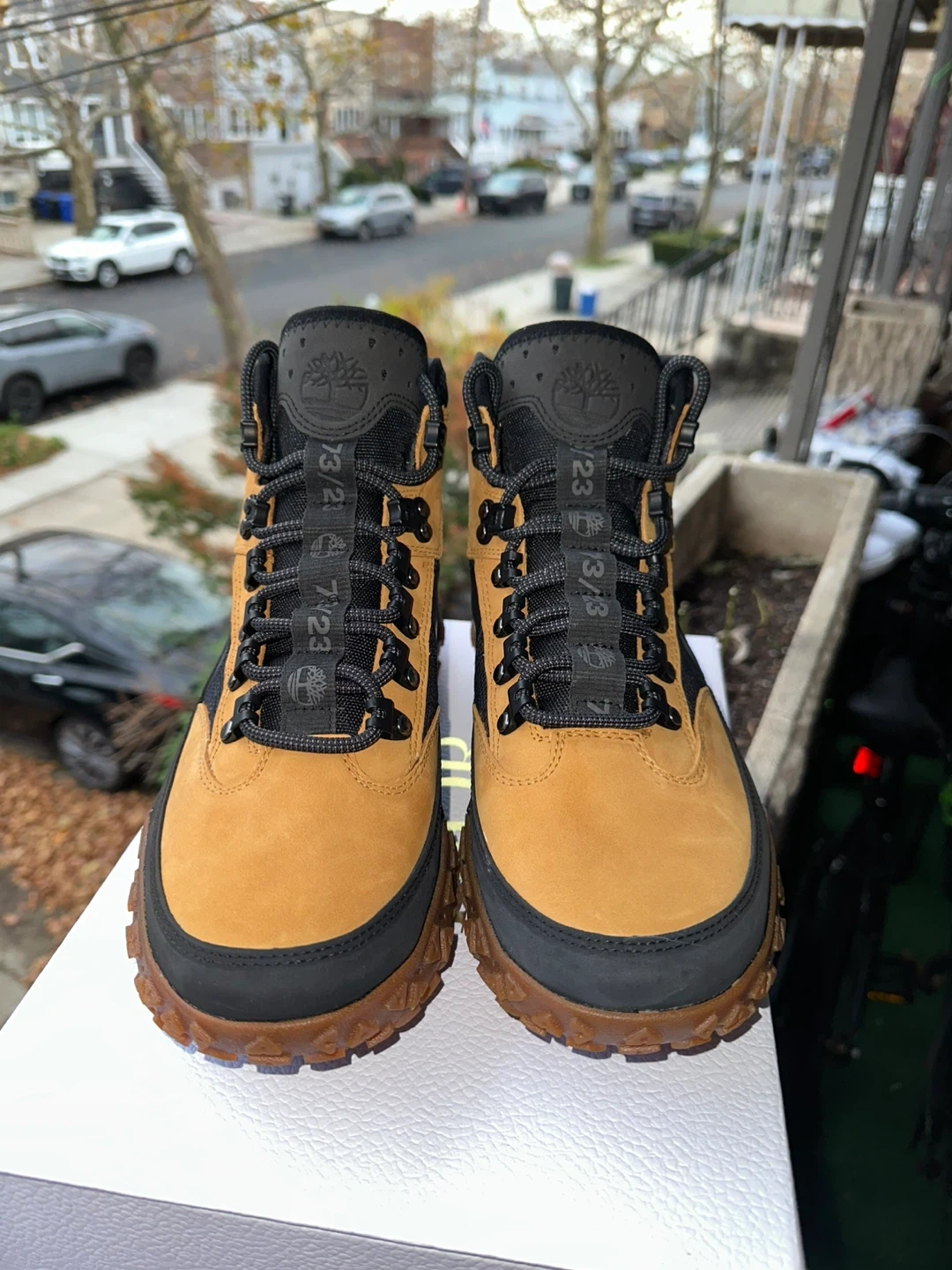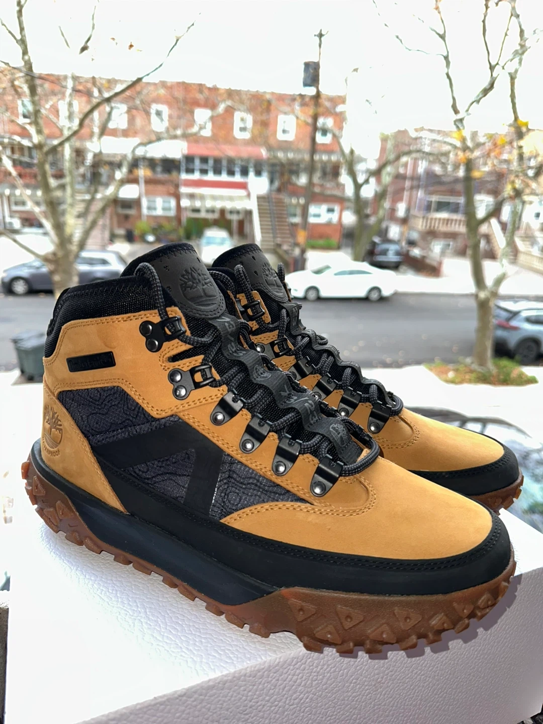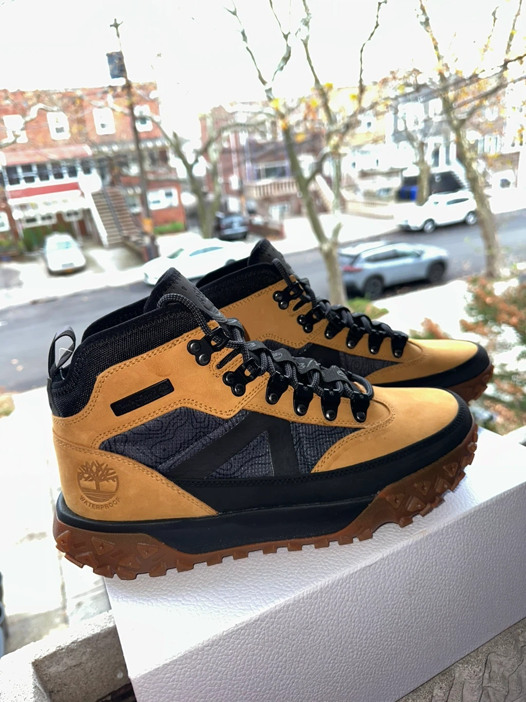 Selling a pair of Timberland waterproof hiking boots! They are in great condition and ready for your next adventure. They feature a rugged design with a comfortable fit. The boots are waterproof, so you don't have to worry about wet conditions. The box is also included!