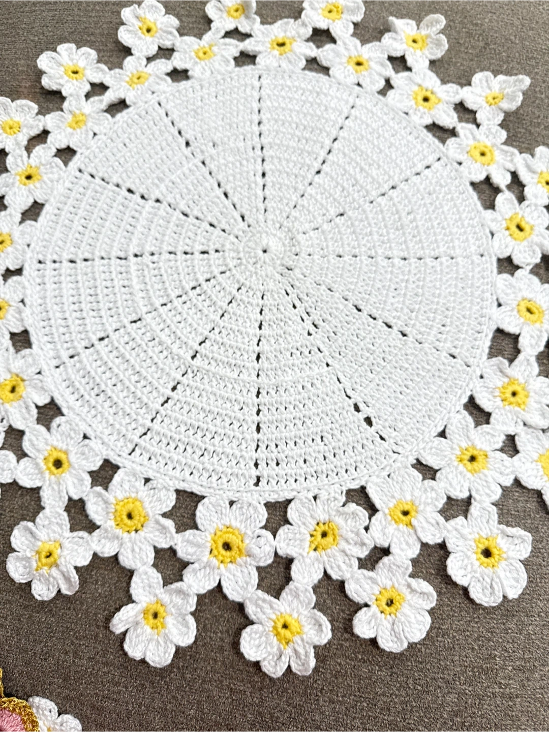 Selling a beautiful, handmade crochet doily featuring a daisy design. It's white and would make a lovely addition to any table or shelf