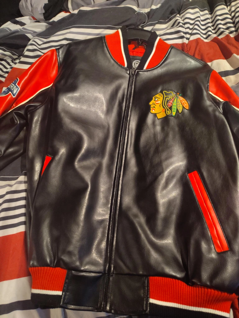 Selling a Chicago Blackhawks leather bomber jacket. It features the Blackhawks logo and red accents. Great for any fan!