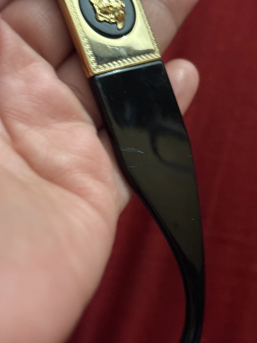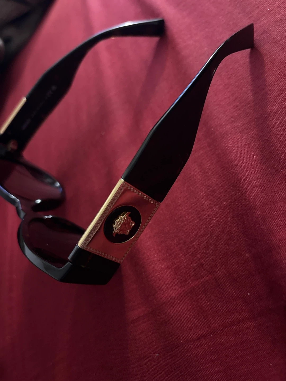 Selling a pair of Versace sunglasses. They have a black frame with the Versace logo on the side. There are some super light scratches on the frame and one small on the side as shown but pretty good still