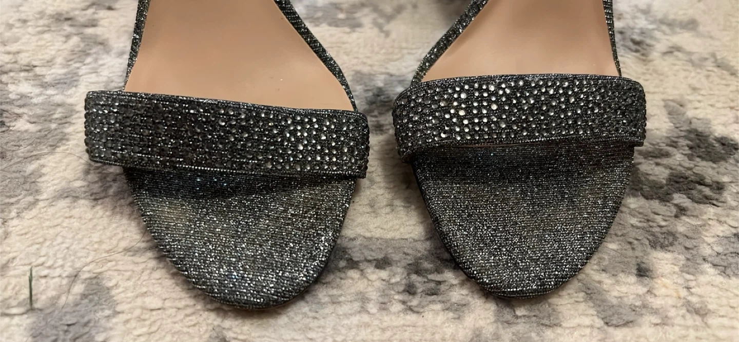 These INC International Concepts heels are a size 7M. They feature a glittery silver design and ankle straps. Perfect for a night out!