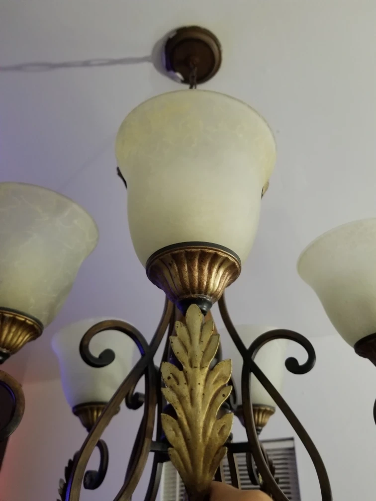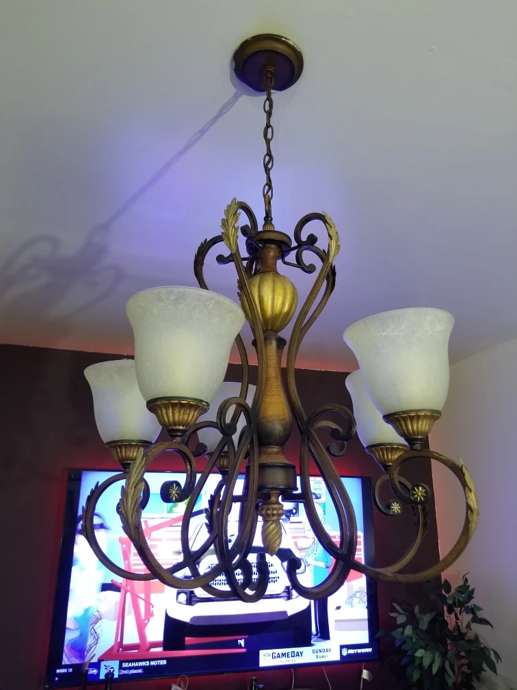 This is a beautiful chandelier with a bronze finish. It features 5 lights and would be a great addition to any dining room or living room