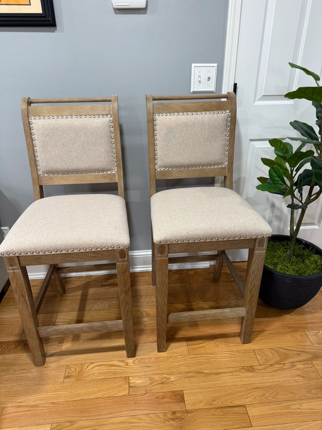 Selling a pair of Linon Emmy upholstered counter stools! They're in great condition and ready to add some style to your kitchen or bar area. The neutral upholstery and nailhead trim give them a classic look.