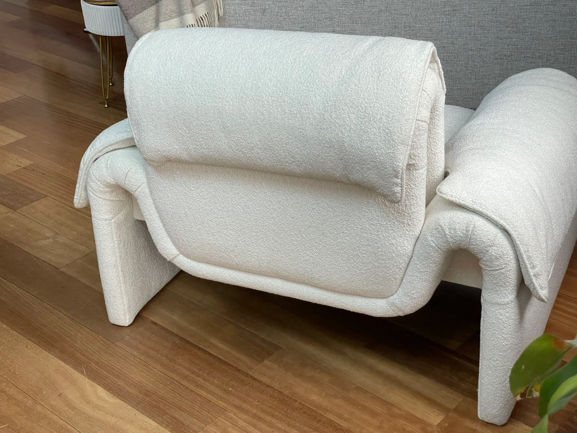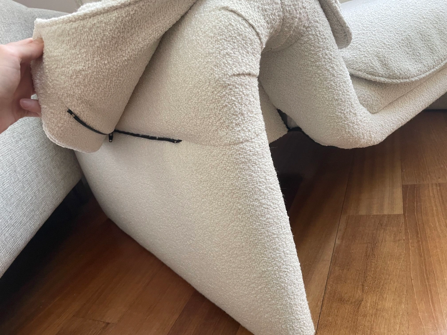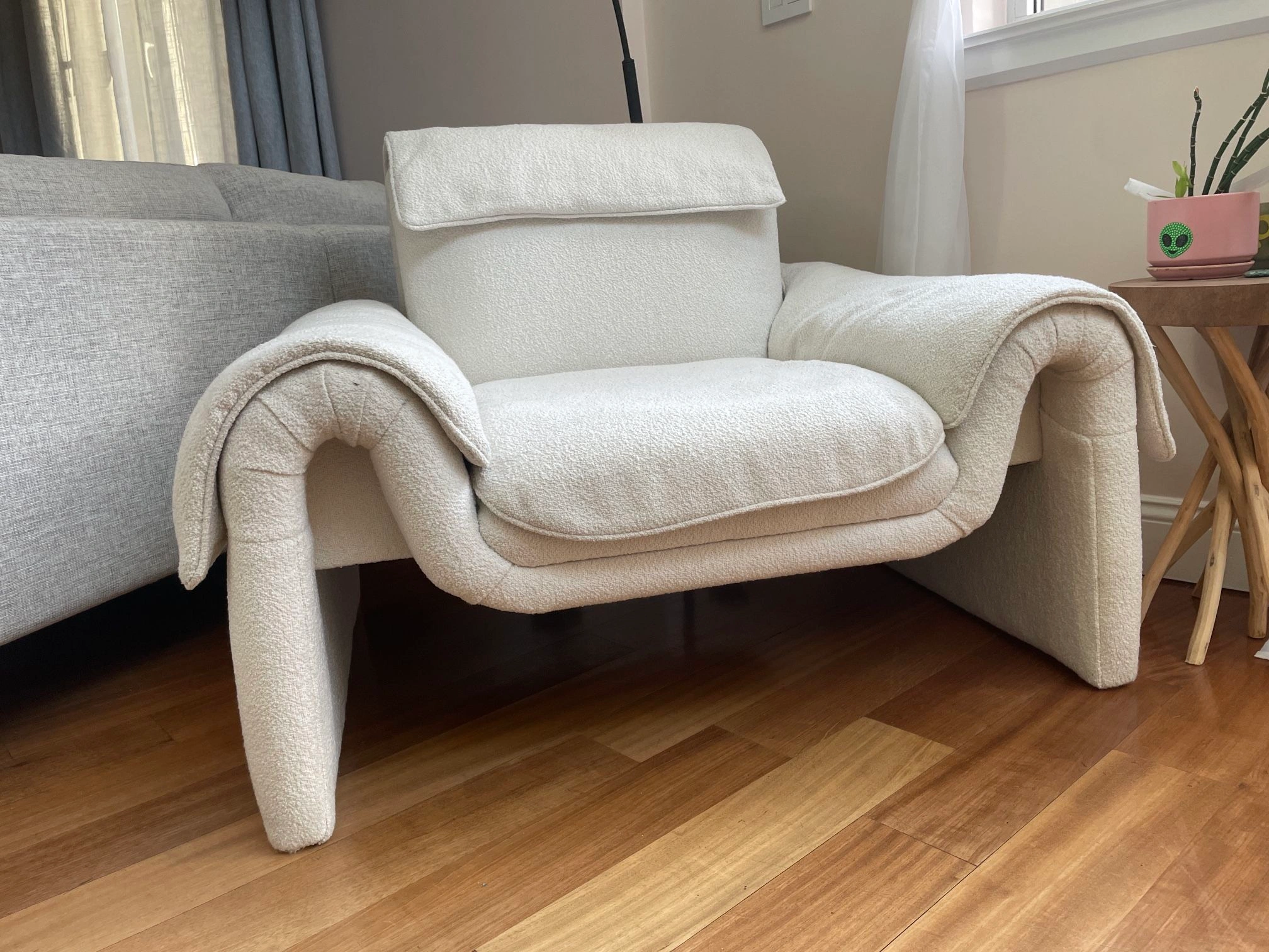 Upholstered in off-white bouclé, every cushion and panel zips off for easy cleaning or re-upholstery — a rare and practical feature for a collectible piece. It was originally sourced from Home Union NYC’s Graham Ave location and has been meticulously cared for in a smoke-free home.