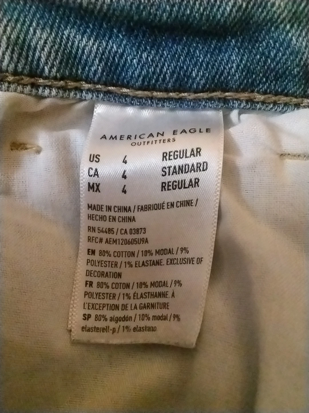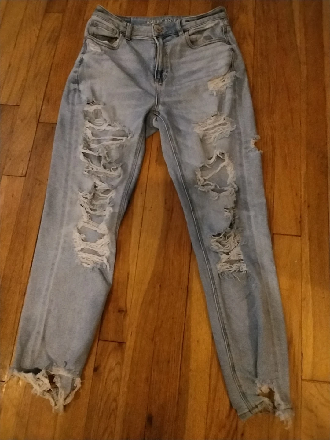 Selling a pair of light wash American Eagle jeans. They are heavily distressed with rips throughout and frayed hems. Great for a casual, edgy look!