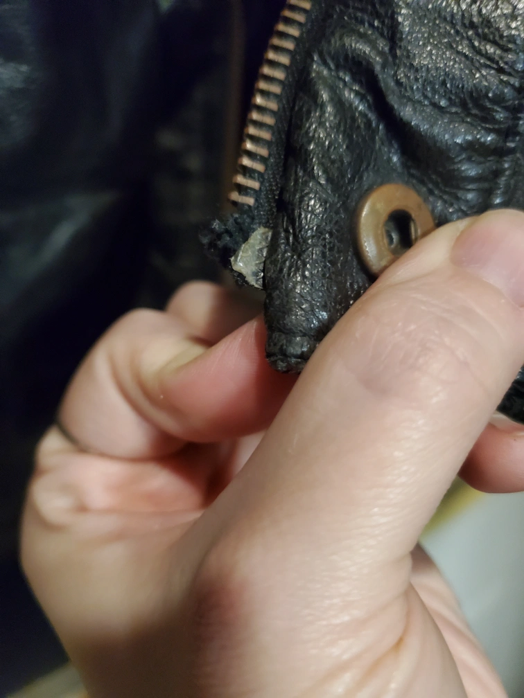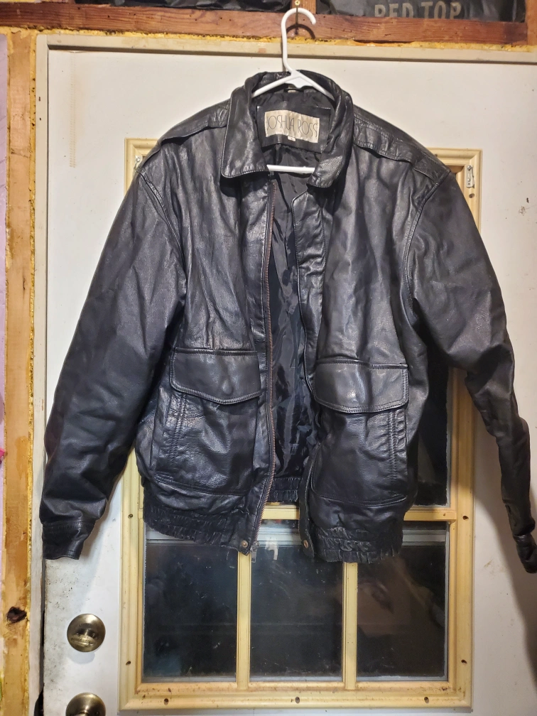 Selling a Joshua Ross leather jacket in size L. It's a classic black leather jacket with a bomber style. The zipper is broken (see pictures) and it needs a good cleaning, but it's still a great jacket!