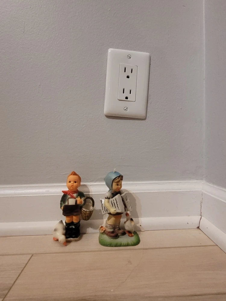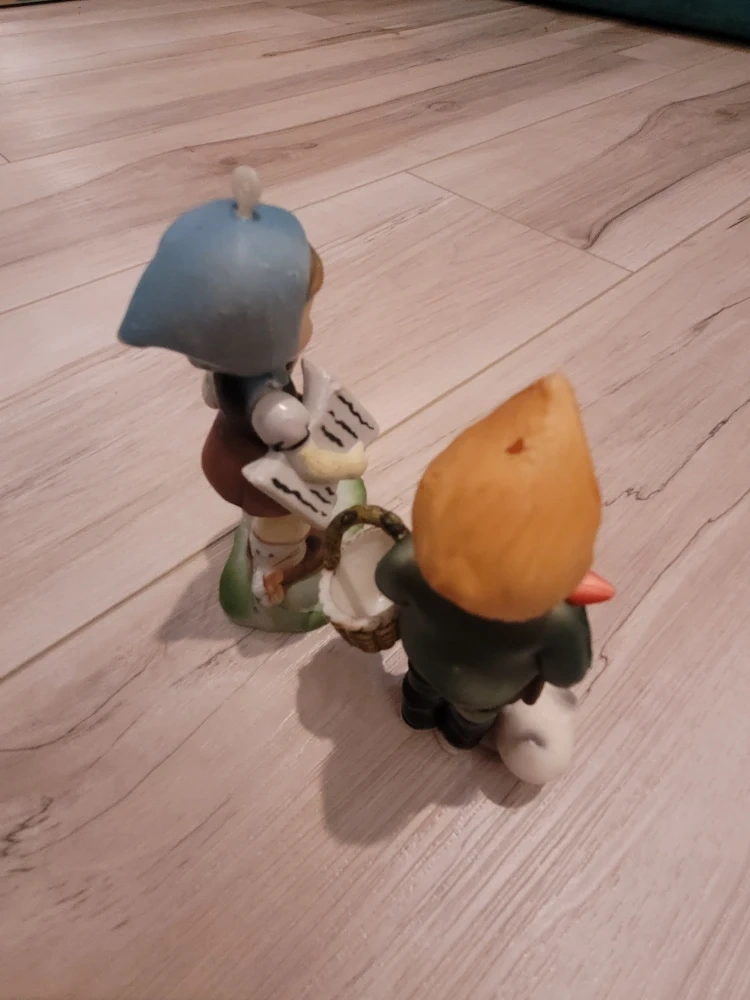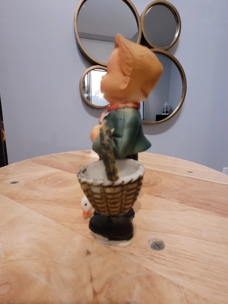 Here are two adorable vintage ornaments in the Hummel style! They feature a boy with a basket and a girl with a newspaper, each accompanied by a cute little goose. Perfect for adding a touch of vintage charm to your home decor. Both together for price. Good condition with a little wear from age. The boy has a tiny hole at the top of his head see with photos.