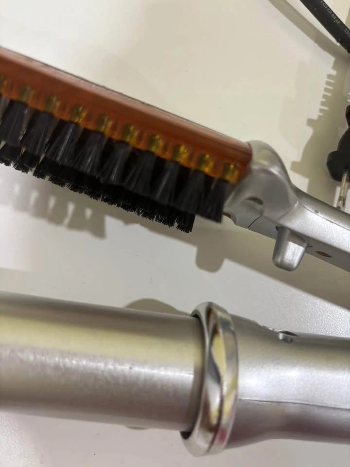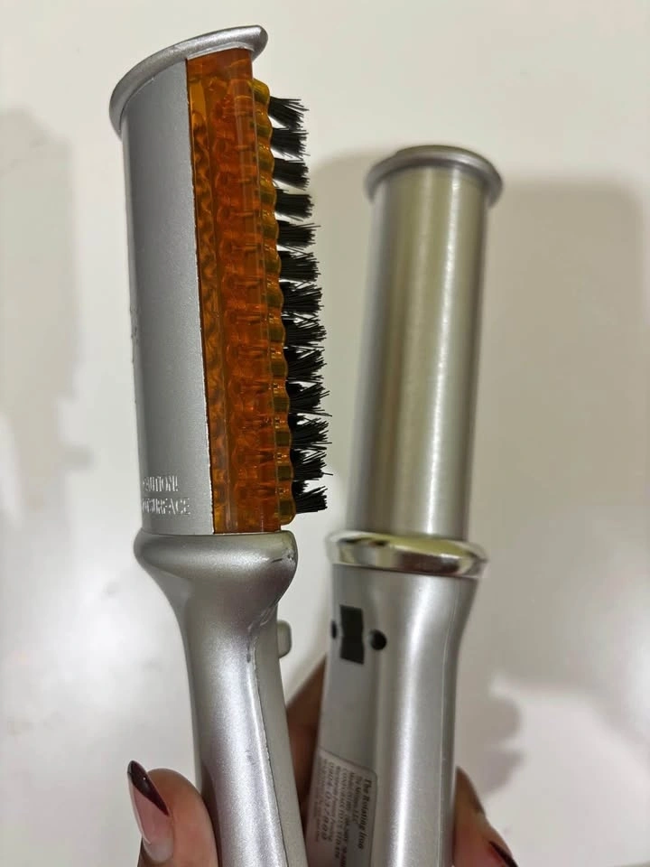 Multi-purpose heated hair styling tool in good working condition. Features a curling barrel with attached brush for smooth styling, added volume, and defined curls.
